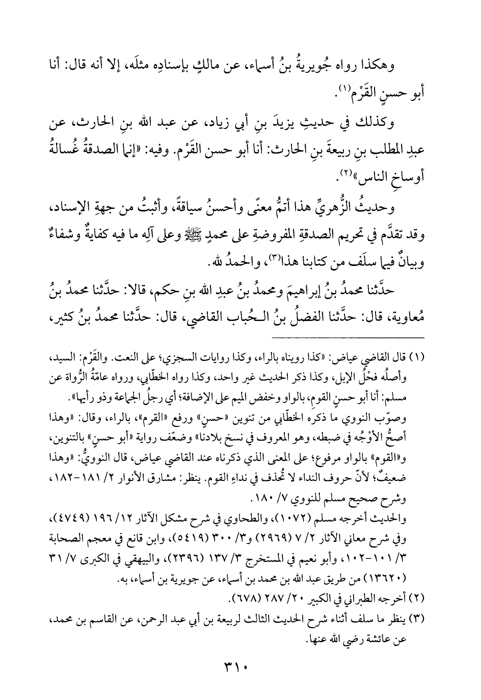 (¬١) قال القاضي عياض: "كذا رويناه بالراء، وكذا روايات السجزي؛ على النعت. والقَرْم: السيد، وأصلُه فحْلُ الإبل، وكذا ذكر الحديث غير واحد، وكذا رواه الخطّابي، ورواه عامّةُ الرُّواة عن مسلم: أنا أبو حسنٍ القومِ، بالواو وخفض الميم على الإضافة؛ أي رجلُ الجماعة وذو رأيها".