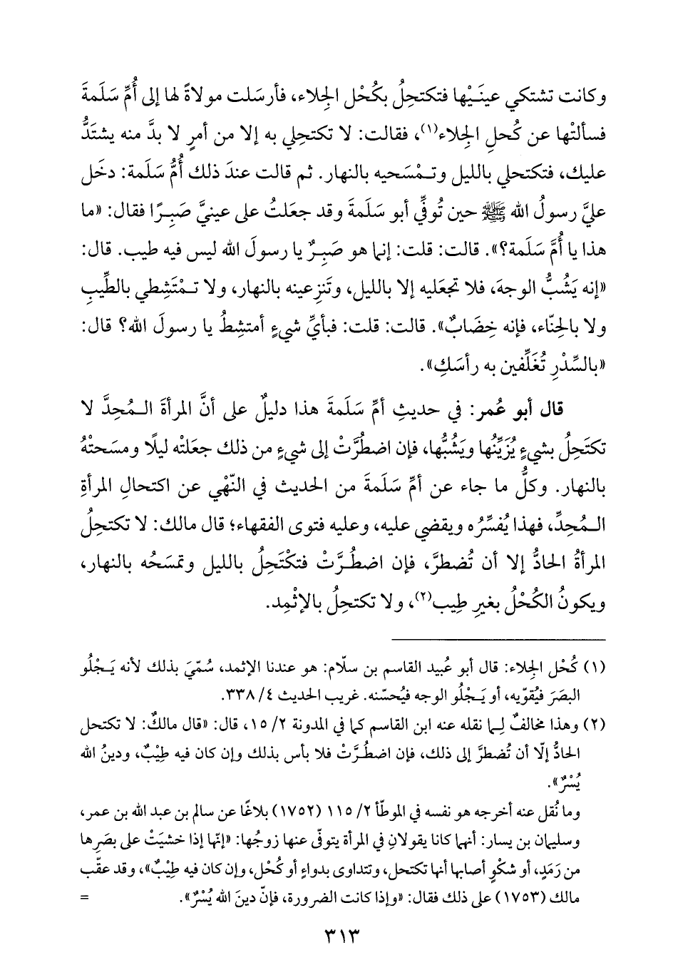 قال أبو عُمر: في حديثِ أمِّ سَلَمةَ هذا دليلٌ على أنَّ المرأةَ المُحِدَّ لا تكتَحِلُ بشيءٍ يُزَيِّنُها ويَشُبُّها، فإن اضطُرَّتْ إلى شيءٍ من ذلك جعَلتْه ليلًا ومسَحتْهُ بالنهار. وكلّ ما جاء عن أمِّ سَلَمةَ من الحديث في النّهْي عن اكتحالِ المرأةِ المُحِدِّ، فهذا يُفسِّرُه ويقضي عليه، وعليه فتوى الفقهاء؛ قال مالك: لا تكتحِلُ المرأةُ الحادُّ إلا أن تُضطرَّ، فإن اضطُرَّتْ فتكْتَحِلُ بالليل وتمسَحُه بالنهار، ويكونُ الكُحْلُ بغيرِ طِيب (¬٢)، ولا تكتحِلُ بالإثْمِد.