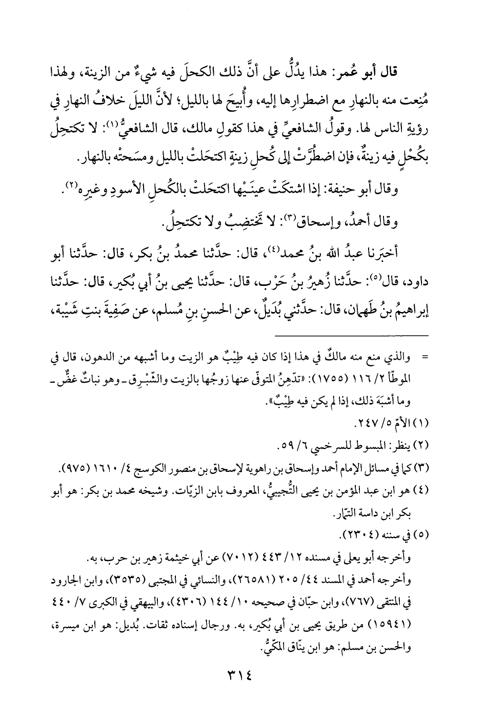 قال أبو عُمر: هذا يدُلُّ على أنَّ ذلك الكحلَ فيه شيءٌ من الزينة، ولهذا مُنِعت منه بالنهارِ مع اضطرارِها إليه، وأُبيحَ لها بالليل؛ لأنَّ الليلَ خلافُ النهارِ في رؤيةِ الناس لها. وقولُ الشافعيِّ في هذا كقولِ مالك، قال الشافعيُّ (¬١): لا تكتحِلُ بكُحْلٍ فيه زينةٌ، فإن اضطُرَّتْ إلى كُحلِ زينةٍ اكتحَلتْ بالليل ومسَحتْه بالنهار.