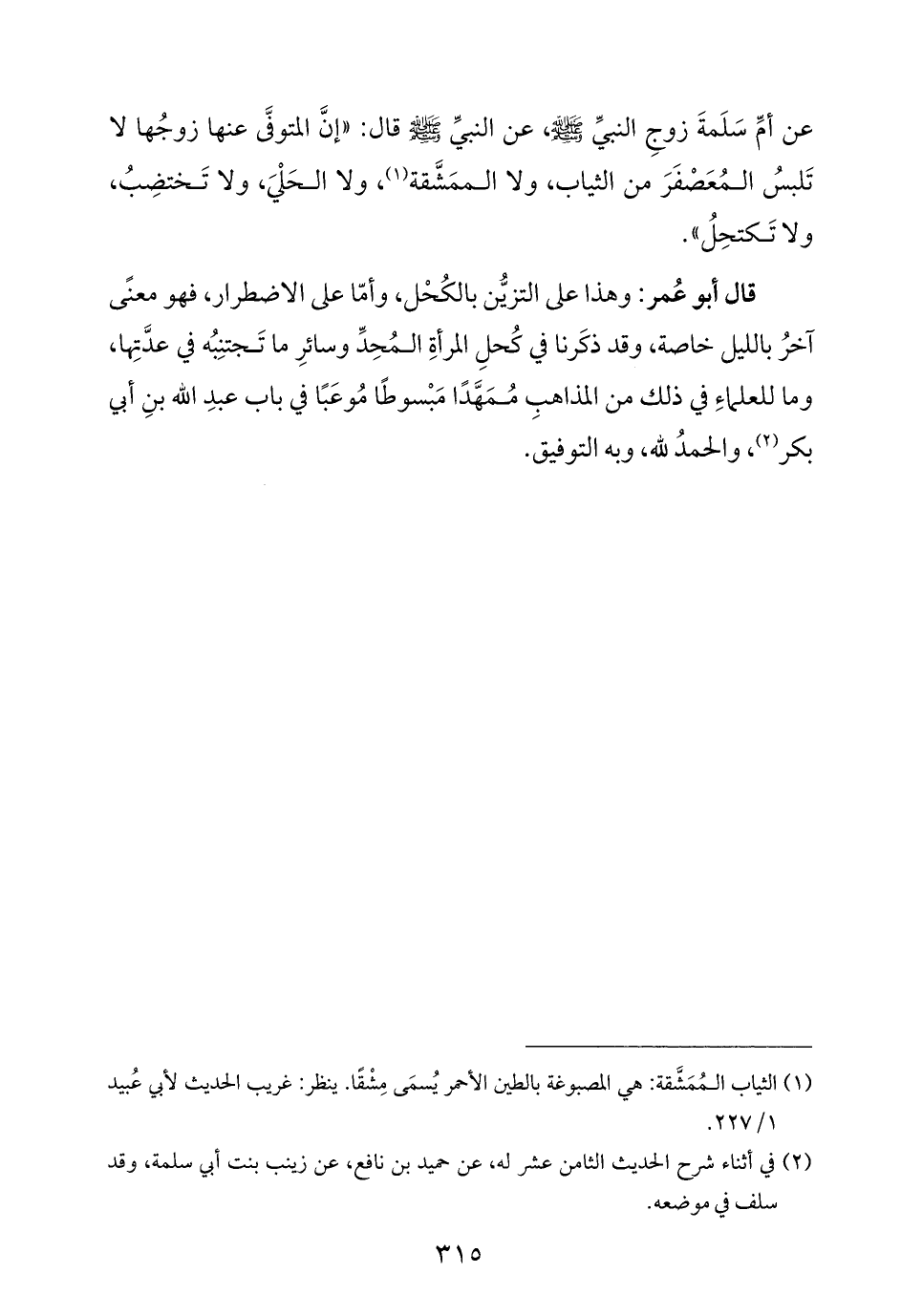 قال أبو عُمر: وهذا على التزيُّن بالكُحْل، وأمّا على الاضطرار، فهو معنًى آخرُ بالليل خاصة، وقد ذكَرنا في كُحلِ المرأةِ المُحِدِّ وسائرِ ما تَجتنِبُه في عدَّتِها، وما للعلماءِ في ذلك من المذاهبِ مُمَهَّدًا مَبْسوطًا مُوعَبًا في باب عبدِ الله بنِ أبي بكر (¬٢)، والحمدُ لله، وبه التوفيق.