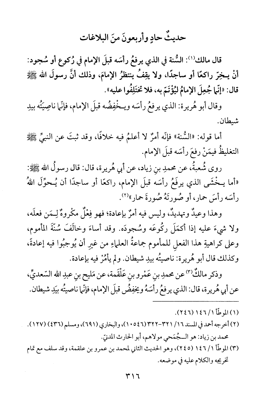 وذكر مالكٌ (¬٣) عن محمدِ بنِ عَمْرو بنِ عَلْقَمة، عن مَليح بنِ عبدِ الله السّعديِّ، عن أبي هُريرة، قال: الذي يرفعُ رأسَهُ ويخفِضُ قبلَ الإمام، فإنّما ناصيتُه بيَدِ شيطان.