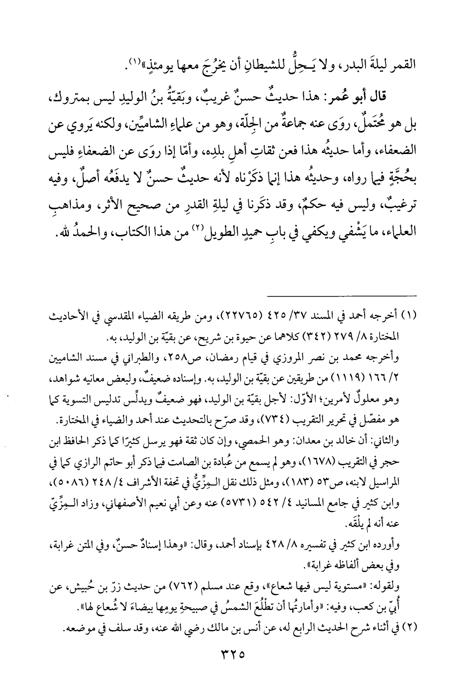 قال أبو عُمر: هذا حديثٌ حسنٌ غريبٌ، وبَقيّةُ بنُ الوليدِ ليس بمتروك، بل هو مُحتَملٌ، روَى عنه جماعةٌ من الجِلّة، وهو من علماءِ الشاميِّين، ولكنه يَروي عن الضعفاء، وأما حديثُه هذا فعن ثقاتِ أهلِ بلدِه، وأمّا إذا روَى عن الضعفاءِ فليس بحُجَّةٍ فيما رواه، وحديثُه هذا إنما ذكَرْناه لأنه حديثٌ حسنٌ لا يدفَعُه أصلٌ، وفيه ترغيبٌ، وليس فيه حكمٌ، وقد ذكَرنا في ليلةِ القدرِ من صحيح الأثر، ومذاهبِ العلماء، ما يَشْفي ويكفي في بابِ حميدٍ الطويل (¬٢) من هذا الكتاب، والحمدُ لله.