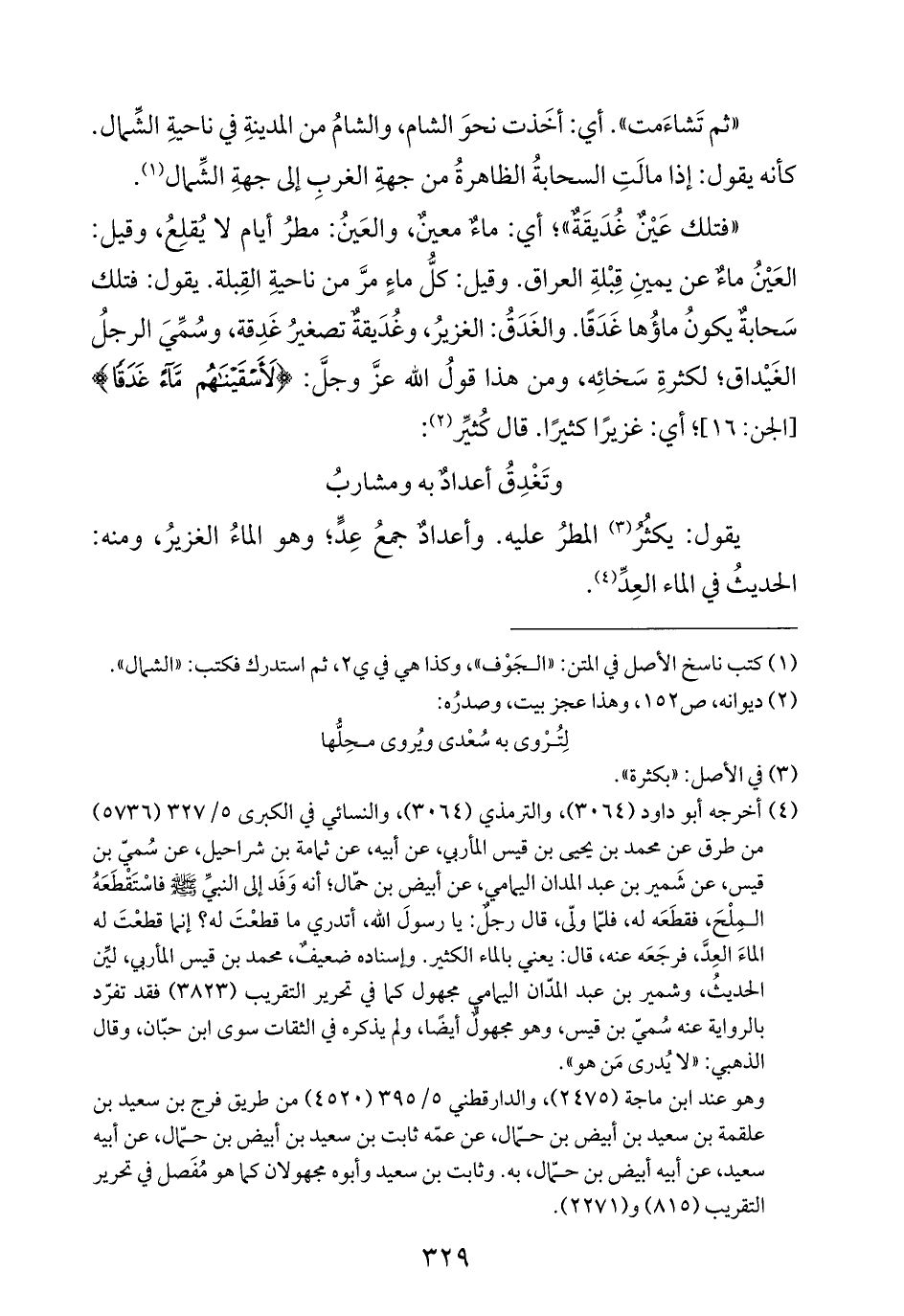 (¬٤) أخرجه أبو داود (٣٠٦٤)، والترمذي (٣٠٦٤)، والنسائي في الكبرى ٥/ ٣٢٧ (٥٧٣٦) من طرق عن محمد بن يحيى بن قيس المأربي، عن أبيه، عن ثمامة بن شراحيل، عن سُميّ بن قيس، عن شَمير بن عبد المدان اليمامي، عن أبيض بن حمّال؛ أنه وَفَد إلى النبيِّ -صلى الله عليه وسلم- فاسْتَقْطَعَهُ المِلْحَ، فقطَعَه له، فلمّا ولّى، قال رجلٌ: يا رسولَ الله، أتدري ما قطعْتَ له؟ إنما قطعْتَ له الماءَ العِدَّ، فرجَعَه عنه، قال: يعني بالماء الكثير. وإسناده ضعيفٌ، محمد بن قيس المأربي، ليِّن الحديثُ، وشمير بن عبد المدّان اليمامى مجهول كما في تحرير التقريب (٣٨٢٣) فقد تفرّد بالرواية عنه سُميّ بن قيس، وهو مجهولٌ أيضًا، ولم يذكره في الثقات سوى ابن حبّان، وقال الذهبي: "لا يُدرى مَن هو".