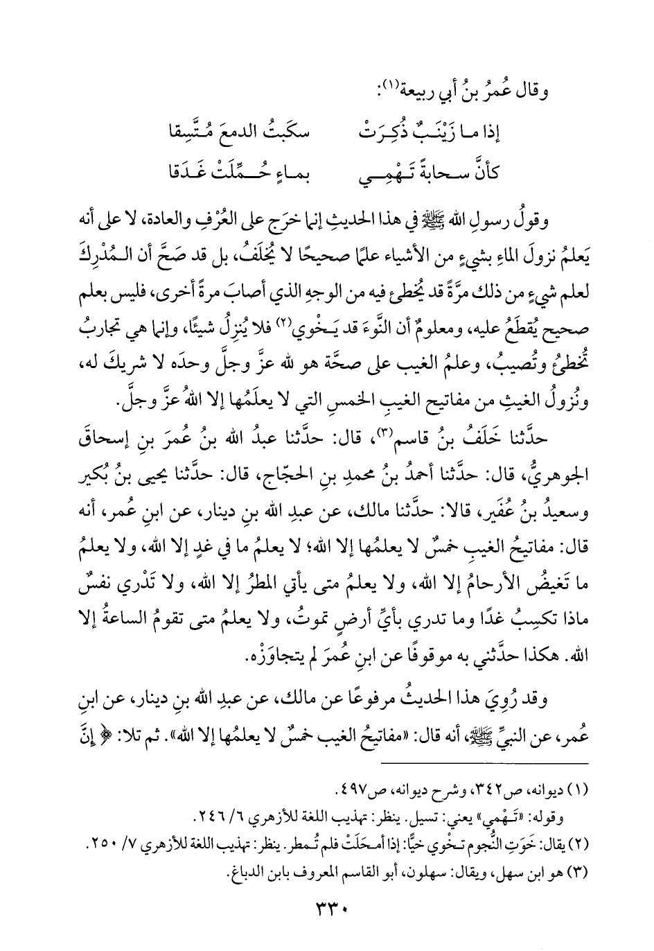 حدَّثنا خَلَفُ بنُ قاسم (¬٣)، قال: حدَّثنا عبدُ الله بنُ عُمرَ بنِ إسحاقَ الجوهريُّ، قال: حدَّثنا أحمدُ بنُ محمدِ بنِ الحجّاج، قال: حدَّثنا يحيى بنُ بُكير وسعيدُ بنُ عُفَير، قالا: حدَّثنا مالك، عن عبدِ الله بنِ دينار، عن ابنِ عُمر، أنه قال: مفاتيحُ الغيبِ خمسٌ لا يعلمُها إلا الله؛ لا يعلمُ ما في غدٍ إلا الله، ولا يعلمُ ما تَغيضُ الأرحامُ إلا الله، ولا يعلمُ متى يأتي المطرُ إلا الله، ولا تَدْري نفسٌ ماذا تكسِبُ غدًا وما تدري بأيِّ أرضٍ تموتُ، ولا يعلمُ متى تقومُ الساعةُ إلا الله. هكذا حدَّثني به موقوفًا عن ابنِ عُمرَ لم يتجاوَزْه.