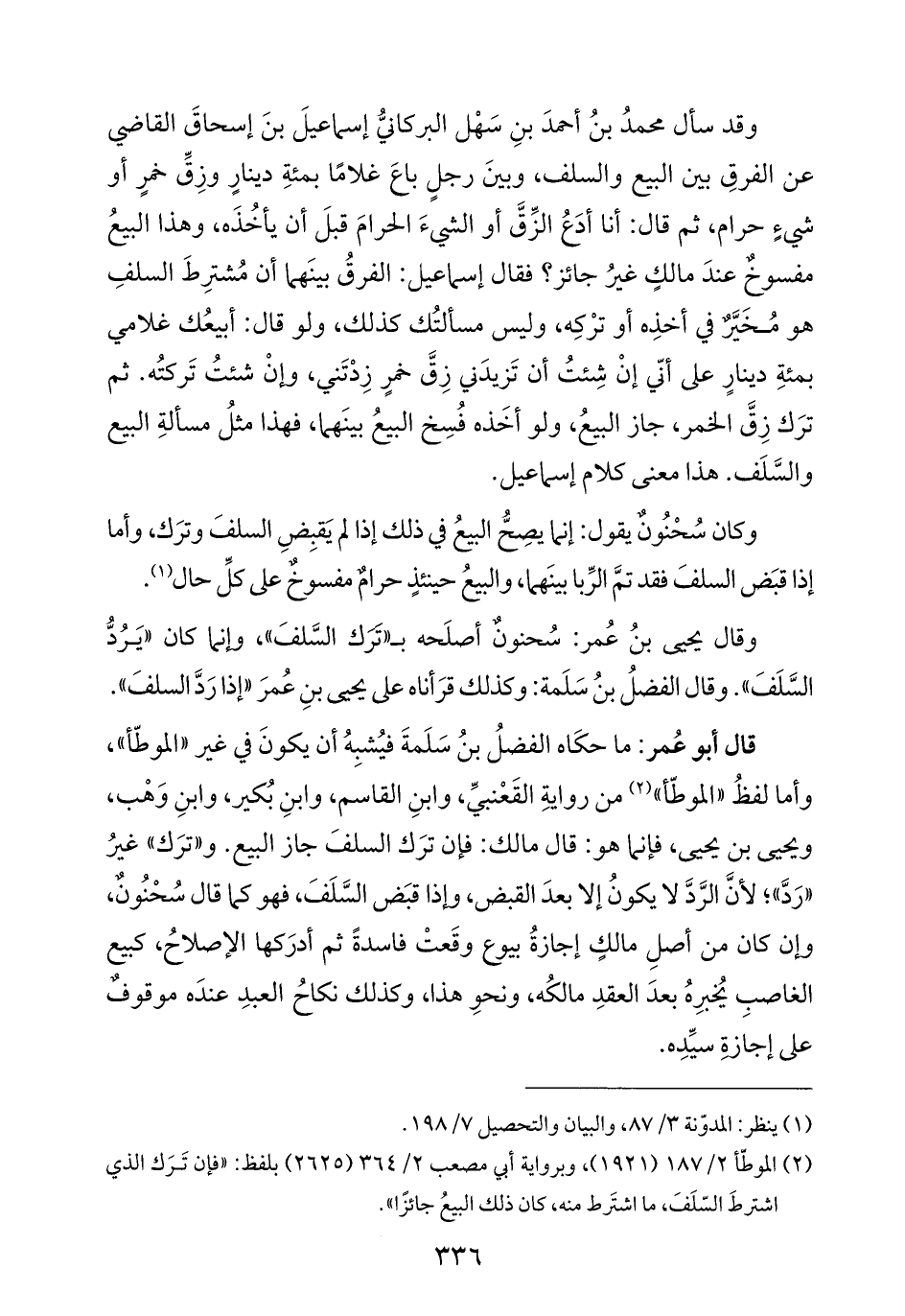 وقال يحيى بنُ عُمر: سُحنونٌ أصلَحه بـ "تَرَك السَّلفَ"، وإنما كان "يَرُدُّ السَّلَفَ". وقال الفضلُ بنُ سَلَمة: وكذلك قرَأناه على يحيى بنِ عُمرَ "إذا رَدَّ السلفَ".