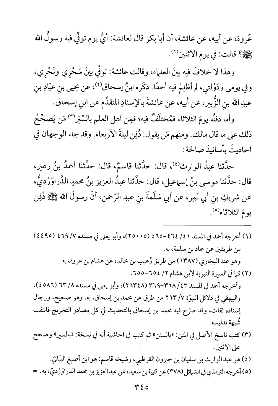 وأما دفنُه يومَ الثلاثاء فمُختلَفٌ فيه؛ فمِن أهل العلم بالسِّيَر (¬٣) مَن يُصحِّحُ ذلك على ما قال مالك. ومنهم مَن يقول: دُفِن ليلةَ الأربعاء. وقد جاء الوجهان في أحاديثَ بأسانيدَ صالحة: