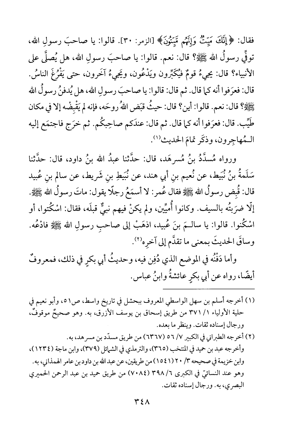ورواه مُسدَّدُ بنُ مُسرهَد، قال: حدَّثنا عبدُ الله بنُ داود، قال: حدَّثنا سَلَمةُ بنُ نُبَيط، عن نُعيم بنِ أبي هند، عن نُبَيطِ بنِ شَريط، عن سالم بنِ عُبيد قال: قُبِض رسولُ الله -صلى الله عليه وسلم- فقال عُمر: لا أسمَعُ رجلًا يقول: ماتَ رسولُ الله -صلى الله عليه وسلم-. إلّا ضرَبتُه بالسيف. وكانوا أُميِّين، ولم يكنْ فيهم نبيٌّ قبلَه، فقال: اسْكُتوا، أو اسْكُنوا. قالوا: يا سالمَ بنَ عُبيد، اذهَبْ إلى صاحبِ رسولِ الله -صلى الله عليه وسلم- فادْعُه. وساقَ الحديثَ بمعنى ما تقدَّم إلى آخرِه (¬٢).