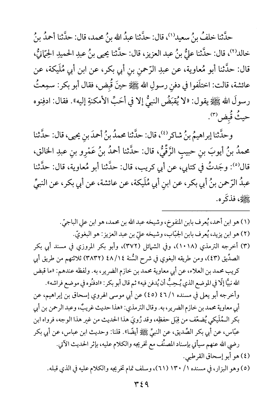 (¬٣) أخرجه الترمذي (١٠١٨)، وفي الشمائل (٣٧٢)، وأبو بكر المروزي في مسند أبي بكر الصدِّيق (٤٣)، ومن طريقه البغوي في شرح السُّنة ١٤/ ٤٨ (٣٨٣٢) ثلاثتهم من طريق أبي كريب محمد بن العلاء، عن أبي معاوية محمد بن خازم الضرير، به. ولفظه عندهم: "ما قبض الله نبيًّا إلّا في الموضع الذي يُحِبُّ أن يُدفن فيه" ثم قال أبو بكر: "ادفنُوه في موضع فراشه".
