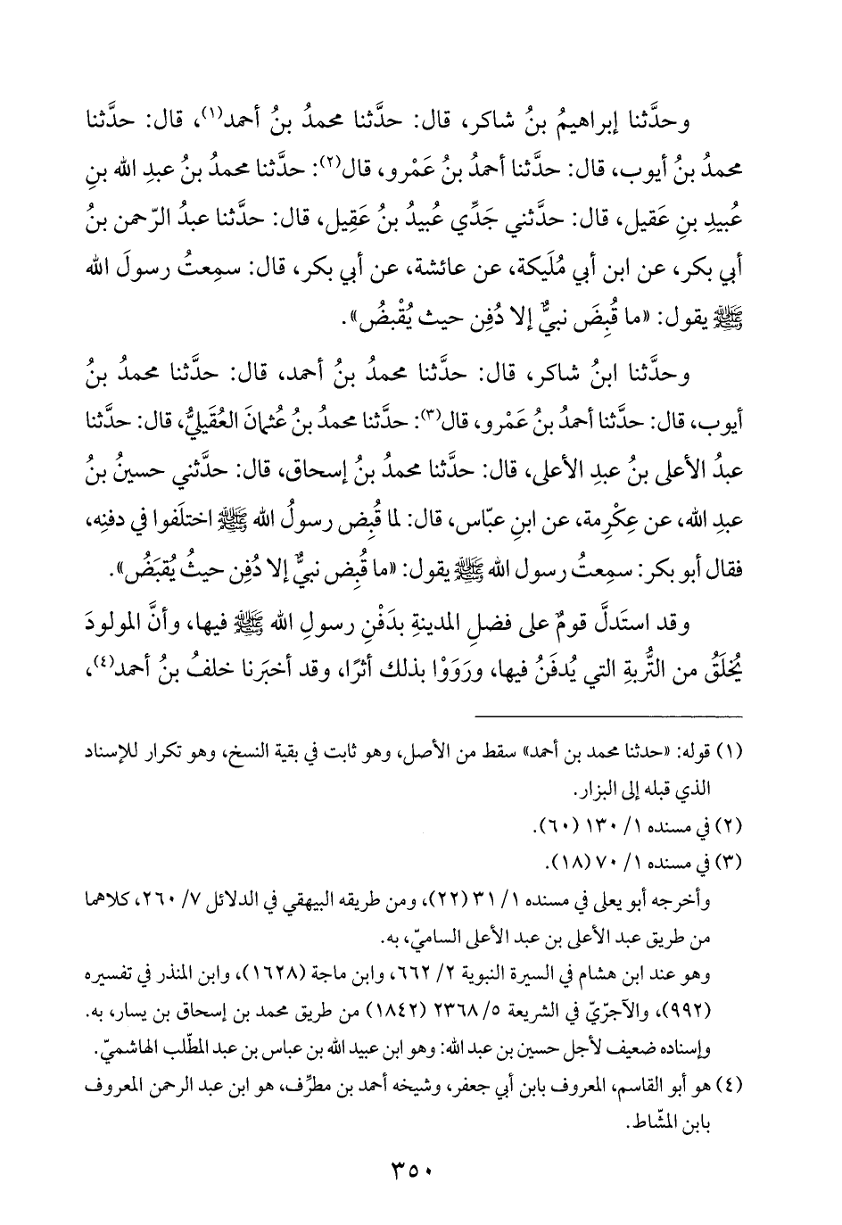 وحدَّثنا ابنُ شاكر، قال: حدَّثنا محمدُ بنُ أحمد، قال: حدَّثنا محمدُ بنُ أيوب، قال: حدَّثنا أحمدُ بنُ عَمْرو، قال (¬٣): حدَّثنا محمدُ بنُ عُثمانَ العُقَيليُّ، قال: حدَّثنا عبدُ الأعلى بنُ عبدِ الأعلى، قال: حدَّثنا محمدُ بنُ إسحاق، قال: حدَّثني حسينُ بنُ عبدِ الله، عن عِكْرِمة، عن ابنِ عبّاس، قال: لما قُبِض رسولُ الله -صلى الله عليه وسلم- اختلَفوا في دفنِه، فقال أبو بكر: سمِعتُ رسول الله -صلى الله عليه وسلم- يقول: "ما قُبِض نبيٌّ إلا دُفِن حيثُ يُقبَضُ".