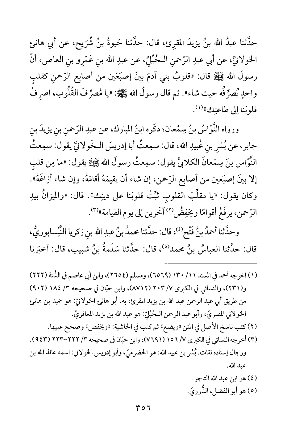 حدَّثنا عبدُ الله بنُ يزيدَ المقرِئ، قال: حدَّثنا حَيوةُ بنُ شُرَيح، عن أبي هانئ الخولانيِّ، عن أبي عبدِ الرّحمنِ الحُبُليِّ، عن عبدِ الله بنِ عَمْرِو بنِ العاص، أنّ رسولَ الله -صلى الله عليه وسلم- قال: "قلوبُ بني آدمَ بينَ إصبَعَين من أصابع الرّحمنِ كقلبٍ واحدٍ يُصرِّفُه حيث شاء". ثم قال رسولُ الله -صلى الله عليه وسلم-: "يا مُصرِّفَ القُلُوب، اصرِفْ قلوبَنا إلى طاعتِك" (¬١).