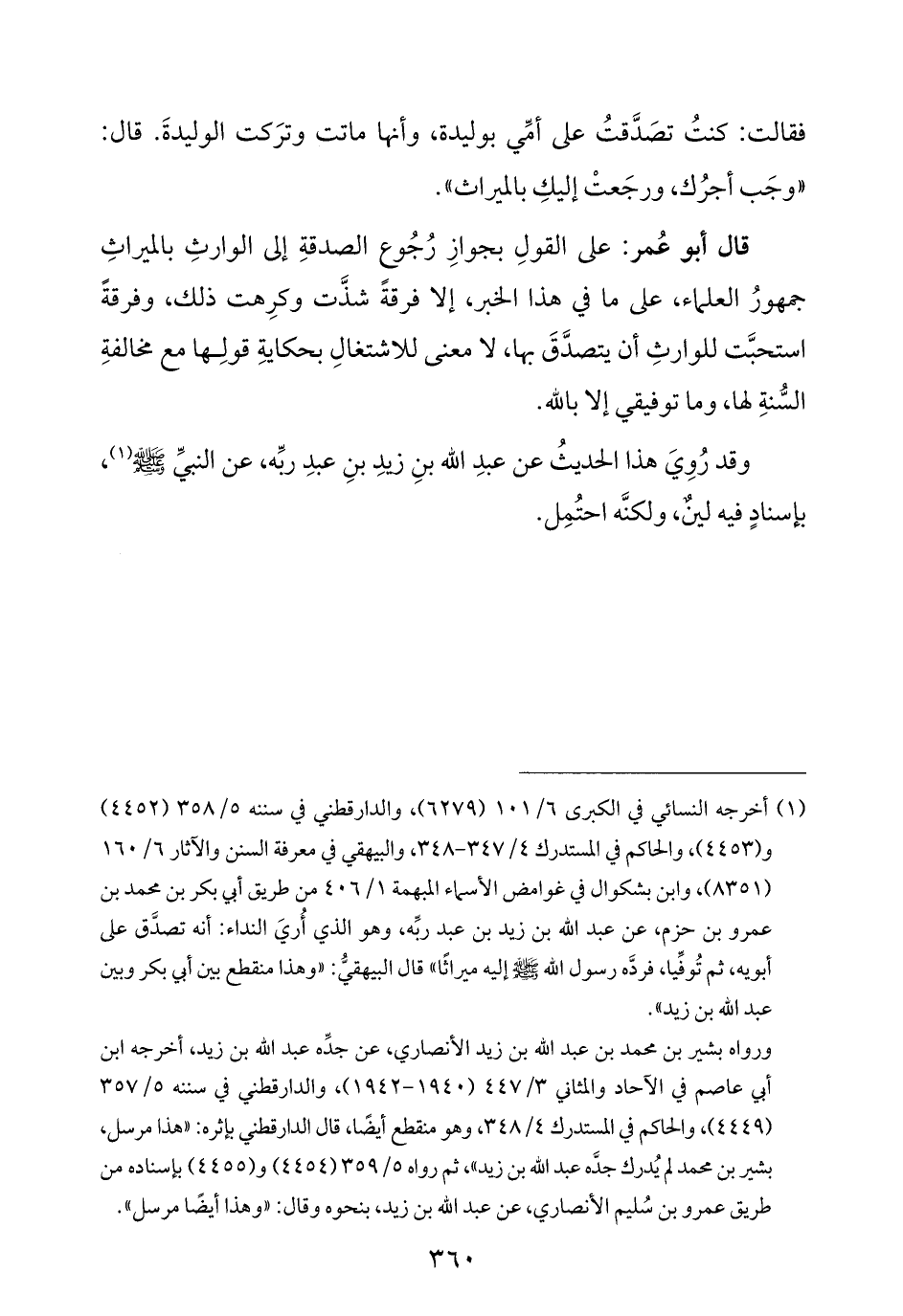 (¬١) أخرجه النسائي في الكبرى ٦/ ١٠١ (٦٢٧٩)، والدارقطني في سننه ٥/ ٣٥٨ (٤٤٥٢) و (٤٤٥٣)، والحاكم في المستدرك ٤/ ٣٤٧ - ٣٤٨، والبيهقي في معرفة السنن والآثار ٦/ ١٦٠ (٨٣٥١)، وابن بشكوال في غوامض الأسماء المبهمة ١/ ٤٠٦ من طريق أبي بكر بن محمد بن عمرو بن حزم، عن عبد الله بن زيد بن عبد ربِّه، وهو الذي أُريَ النداء: أنه تصدَّق على أبويه، ثم تُوفِّيا، فردَّه رسول الله -صلى الله عليه وسلم- إليه ميراثًا" قال البيهقيُّ: "وهذا منقطع بين أبي بكر وبين عبد الله بن زيد".