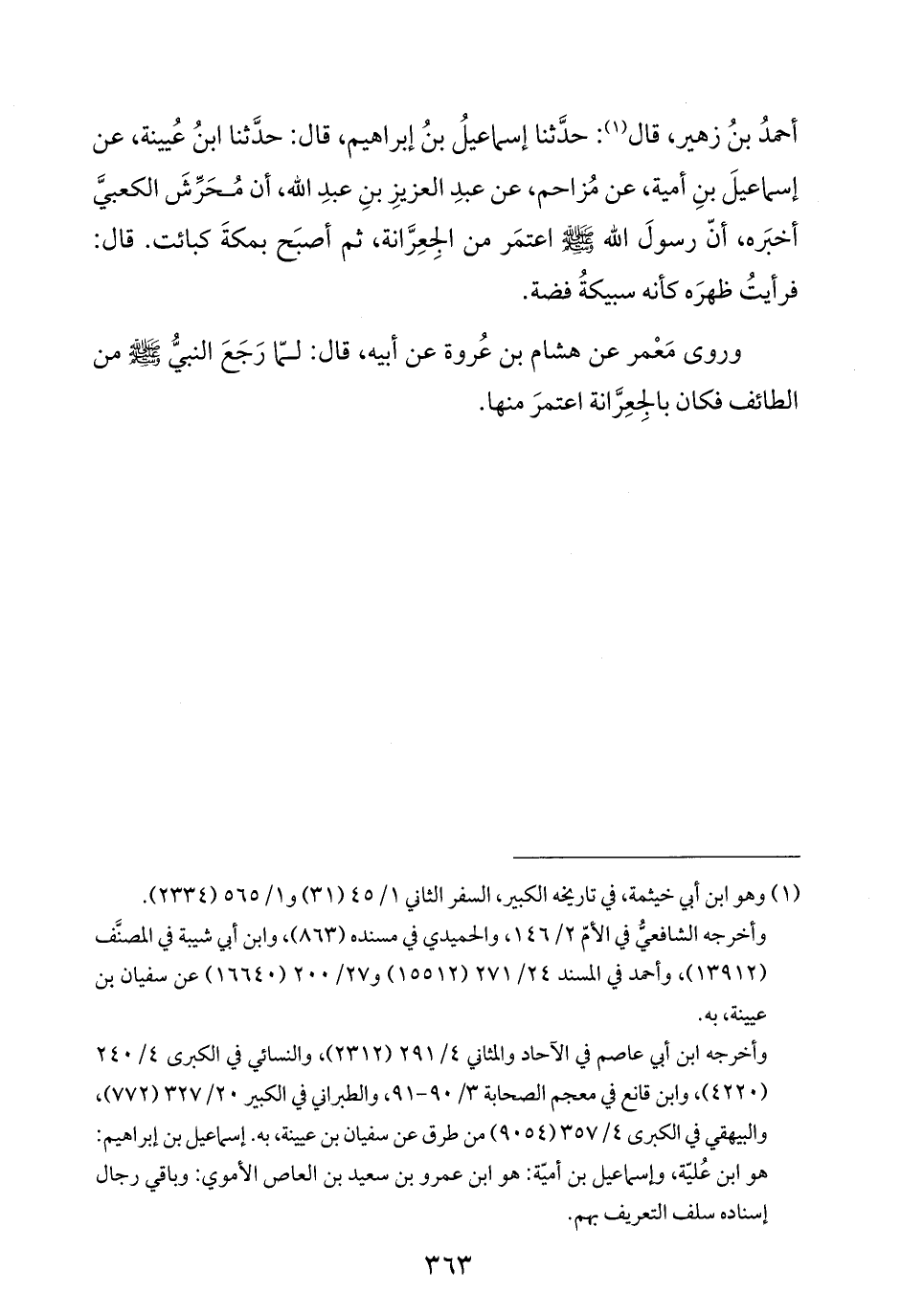 أحمدُ بنُ زهير، قال (¬١): حدَّثنا إسماعيلُ بنُ إبراهيم، قال: حدَّثنا ابنُ عُيينة، عن إسماعيلَ بنِ أمية، عن مُزاحم، عن عبدِ العزيزِ بنِ عبدِ الله، أن مُحَرِّشَ الكعبيَّ أخبَره، أنّ رسولَ الله -صلى الله عليه وسلم- اعتمَر من الجِعِرَّانة، ثم أصبَح بمكةَ كبائت. قال: فرأيتُ ظهرَه كأنه سبيكةُ فضة.