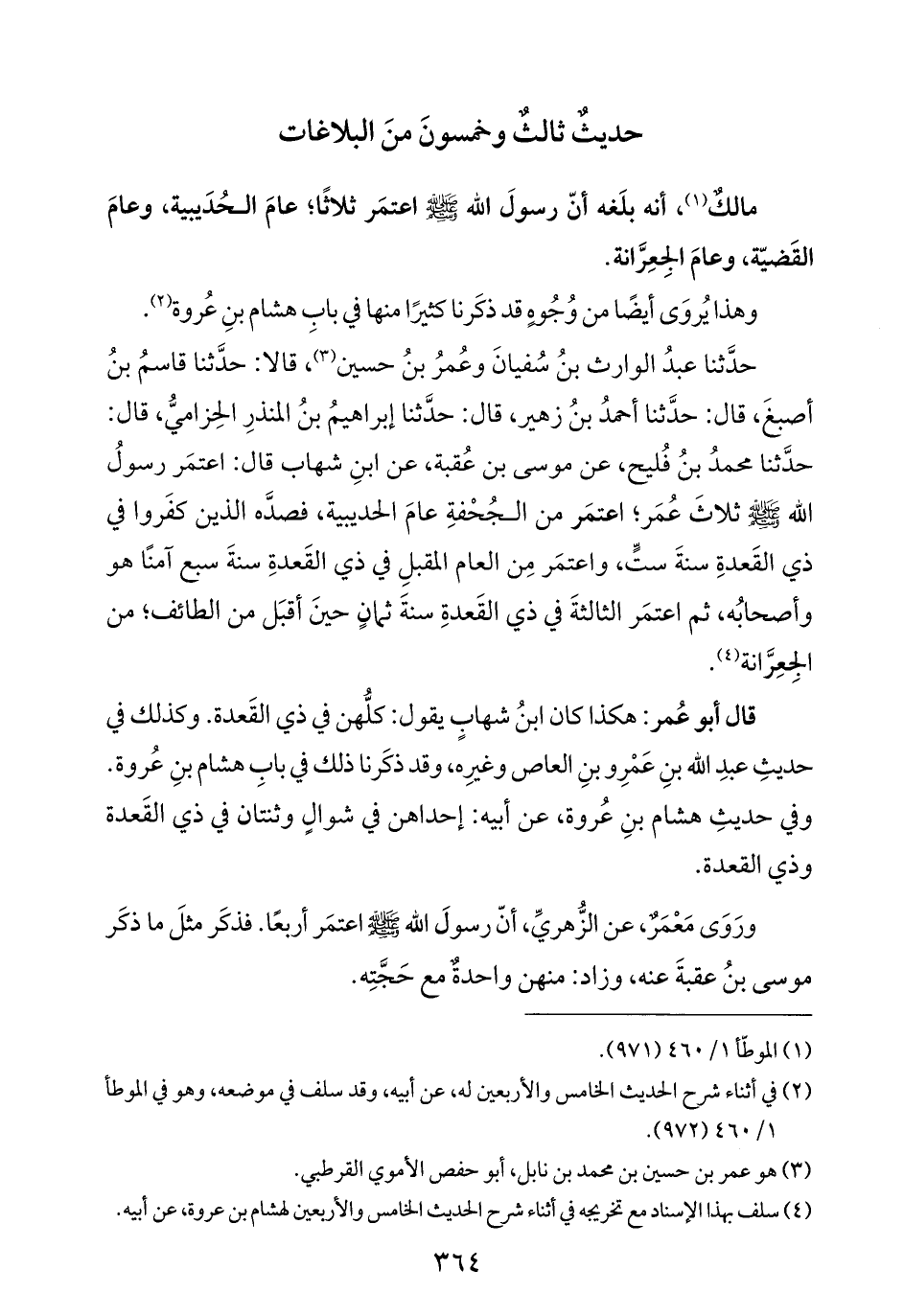 مالكٌ (¬١)، أنه بلَغه أنّ رسولَ الله -صلى الله عليه وسلم- اعتمَر ثلاثًا؛ عامَ الحُدَيبية، وعامَ القَضيّة، وعامَ الجِعِرَّانة.