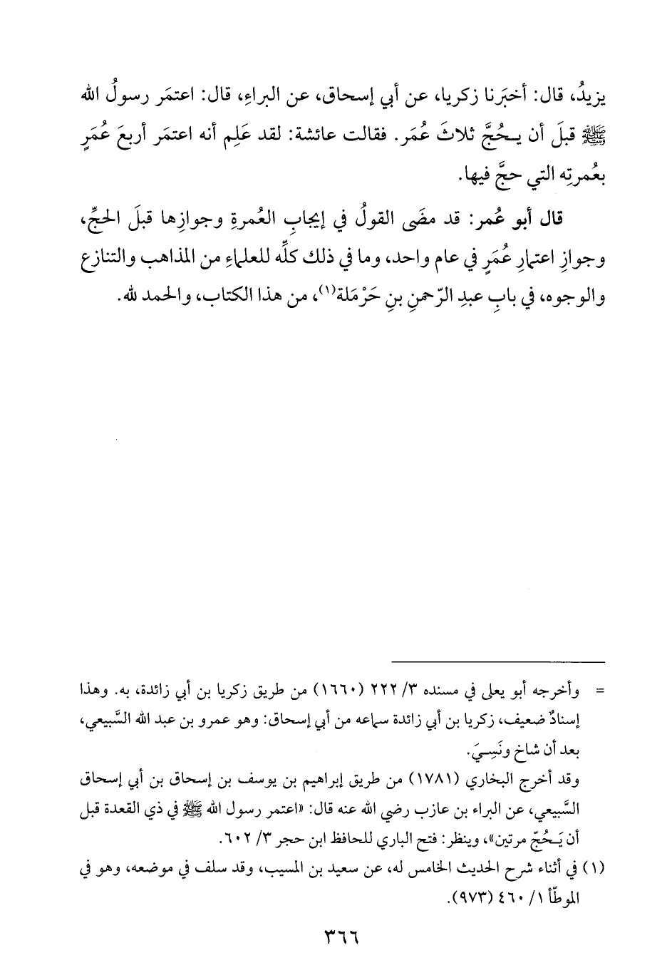 قال أبو عُمر: قد مضَى القولُ في إيجابِ العُمرةِ وجوازِها قبلَ الحجِّ، وجوازِ اعتمارِ عُمَرٍ في عام واحد، وما في ذلك كلِّه للعلماءِ من المذاهب والتنازع والوجوه، في بابِ عبدِ الرّحمنِ بنِ حَرْمَلة (¬١)، من هذا الكتاب، والحمد لله.