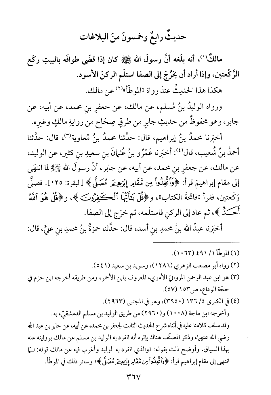 أخبَرنا محمدُ بنُ إبراهيم، قال: حدَّثنا محمدُ بنُ مُعاوية (¬٣)، قال: حدَّثنا أحمدُ بنُ شُعيب، قال (¬٤): أخبَرنا عَمْرُو بنُ عُثمانَ بنِ سعيدِ بنِ كثير، عن الوليد، عن مالك، عن جعفرِ بنِ محمد، عن أبيه، عن جابر، أنّ رسولَ الله -صلى الله عليه وسلم- لما انتهَى إلى مقام إبراهيمَ قرأ: {وَاتَّخِذُوا مِنْ مَقَامِ إِبْرَاهِيمَ مُصَلًّى} [البقرة: ١٢٥]. فصلَّى رَكْعتين، فقرأ "فاتحةَ الكتاب"، و {قُلْ يَاأَيُّهَا الْكَافِرُونَ}، و {قُلْ هُوَ اللَّهُ أَحَدٌ}، ثم عاد إلى الركنِ فاستلَمه، ثم خرَج إلى الصفا.