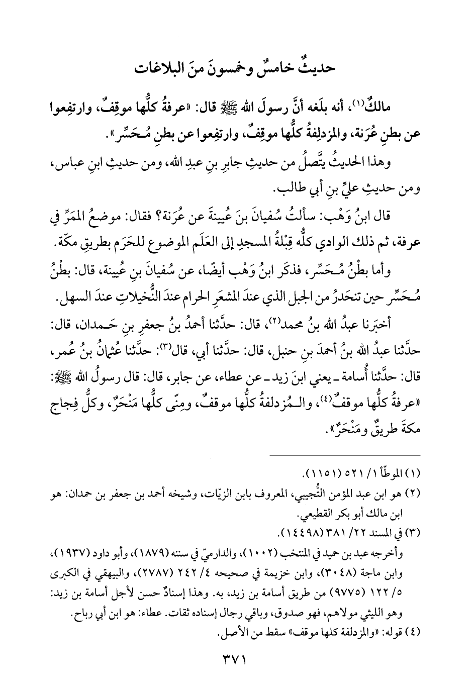 مالكٌ (¬١)، أنه بلَغه أنَّ رسولَ الله -صلى الله عليه وسلم- قال: "عرفةُ كلُّها موقِفٌ، وارتفِعوا عن بطنِ عُرَنة، والمزدلِفةُ كلُّها موقِفٌ، وارتفِعوا عن بطنِ مُحَسِّر".