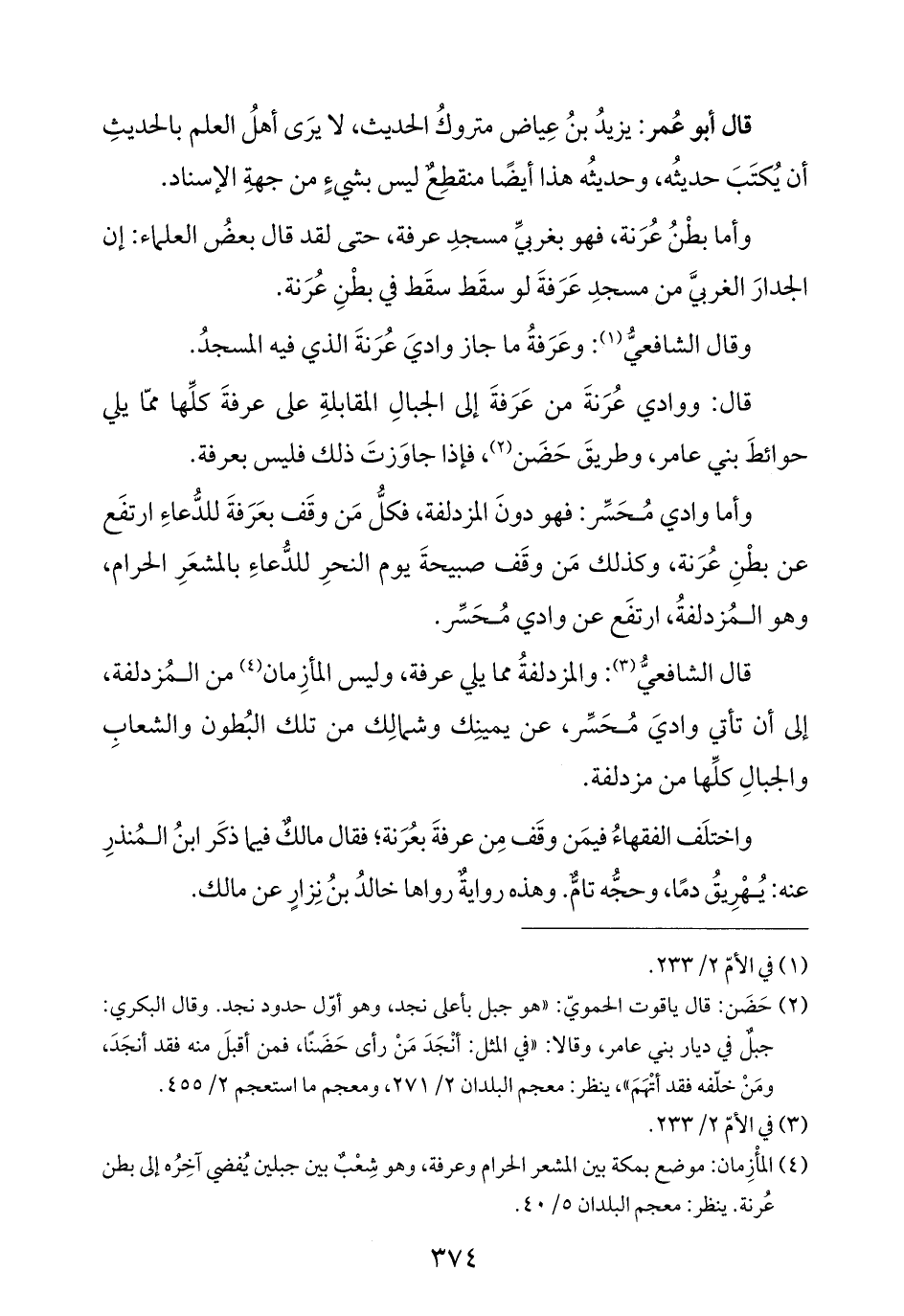 قال: ووادي عُرَنةَ من عَرَفةَ إلى الجبالِ المقابلةِ على عرفةَ كلِّها ممّا يلي حوائطَ بني عامر، وطريقَ حَضَن (¬٢)، فإذا جاوَزتَ ذلك فليس بعرفة.