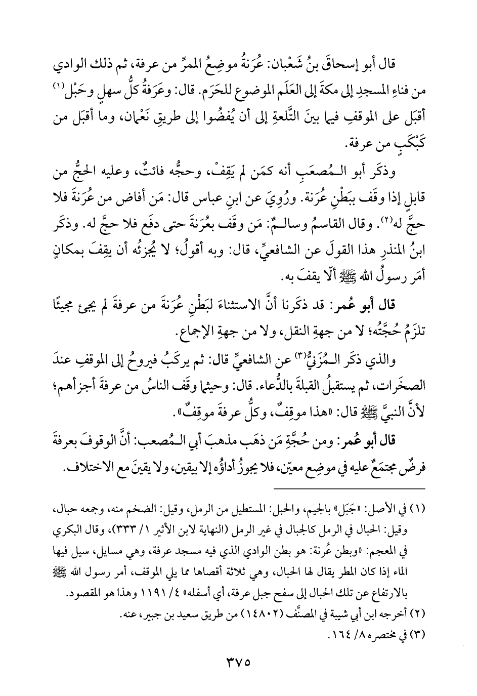 قال أبو عُمر: ومن حُجَّةِ مَن ذهَب مذهبَ أبي المُصعب: أنَّ الوقوفَ بعرفةَ فرضٌ مجتمَعٌ عليه في موضِع معيّن، فلا يجوزُ أداؤُه إلا بيقين، ولا يقينَ مع الاختلاف.