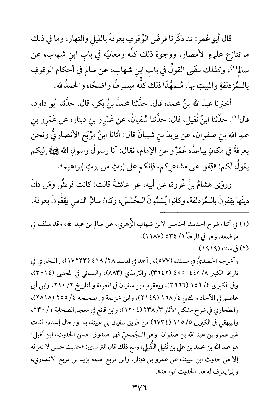 قال أبو عُمر: قد ذكَرنا فرضَ الوُقوفِ بعرفةَ بالليلِ والنهار، وما في ذلك ما تنازع علماءِ الأمصار، ووجوهَ ذلك كلِّه ومعانيَه في بابِ ابنِ شهاب، عن سالم (¬١)، وكذلك مضَى القولُ في بابِ ابنِ شهاب، عن سالم في أحكام الوقوفِ بالمُزدلفةِ والمبيتِ بها، مُمهَّدًا ذلك كلُّه مبسوطًا واضحًا، والحمدُ لله.