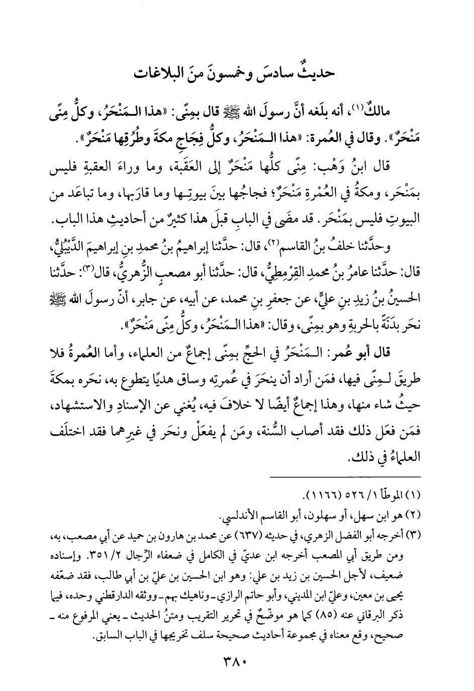 مالكٌ (¬١)، أنه بلَغه أنَّ رسولَ الله -صلى الله عليه وسلم- قال بمِنًى: "هذا المَنْحَرُ، وكلُّ مِنًى مَنْحَرٌ". وقال في العُمرة: "هذا المَنْحَرُ، وكُلُّ فِجَاجِ مكةَ وطُرُقِها مَنْحَرٌ".