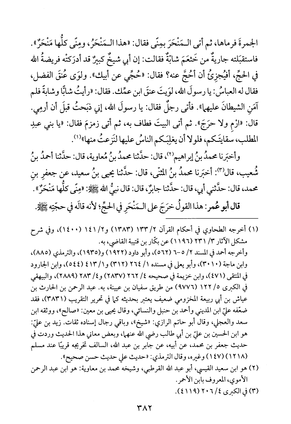 فاستقبَلته جاريةٌ من خَثعَمَ شابّةٌ فقالت: إن أبي شيخٌ كبيرٌ قد أدرَكتْه فريضةُ الله في الحجِّ، أفيُجزِئُ أن أحُجَّ عنه؟ فقال: "حُجِّي عن أبيك". ولوَى عُنقَ الفضل، فقال له العباسُ: يا رسولَ الله، لوَيتَ عنقَ ابن عمِّك. فقال: "رأيتُ شابًّا وشابةً فلم آمَنِ الشيطانَ عليهما". فأتى رجلٌ فقال: يا رسولَ الله، إني ذبَحتُ قبلَ أن أرمِي. قال: "ارْمِ ولا حرَجَ". ثم أتى البيتَ فطاف به، ثم أتى زمزمَ فقال: "يا بني عبدِ المطلب، سقايتَكم، فلولا أن يغلِبَكم الناسُ عليها لنَزعتُ منها" (¬١).