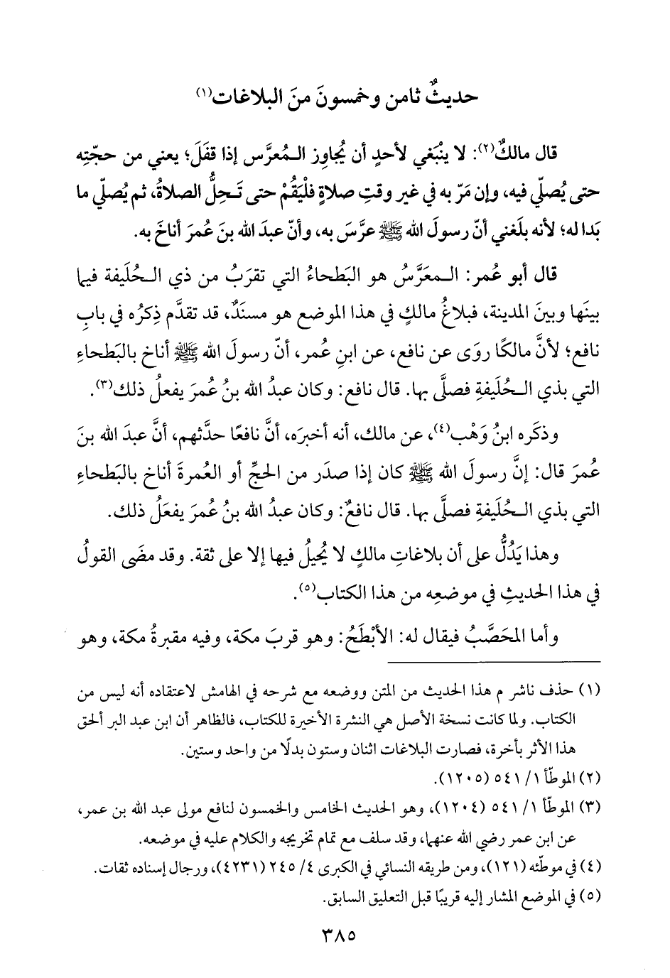 قال مالكٌ (¬٢): لا ينْبَغي لأحدٍ أن يُجاوِز المُعرَّس إذا قفَلَ؛ يعني من حجّتِه حتى يُصلّي فيه، وإن مَرّ به في غير وقتِ صلاةٍ فلْيَقُمْ حتى تَحِلُّ الصلاةُ، ثم يُصلّي ما بَدا له؛ لأنه بلَغني أنّ رسولَ الله -صلى الله عليه وسلم- عرَّسَ به، وأنّ عبدَ الله بنَ عُمرَ أناخَ به.