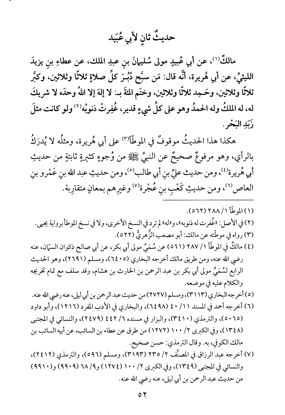 مالكٌ (¬١)، عن أبي عُبيدٍ مولى سُليمانَ بنِ عبدِ الملك، عن عطاءِ بنِ يزيدَ الليثيِّ، عن أبي هُريرة، أنَّه قال: مَن سبَّح دُبُرَ كلِّ صلاةٍ ثلاثًا وثلاثين، وكبَّر ثلاثًا وثلاثين، وحَمِد ثلاثًا وثلاثين، وختَم المئةَ بـ: لا إلهَ إلا اللهُ وحدَه لا شريكَ له، له الملكُ وله الحمدُ وهو على كلِّ شيءٍ قدير، غُفِرتْ ذنوبُه (¬٢) ولو كانت مثلَ زَبَدِ البَحْر.
