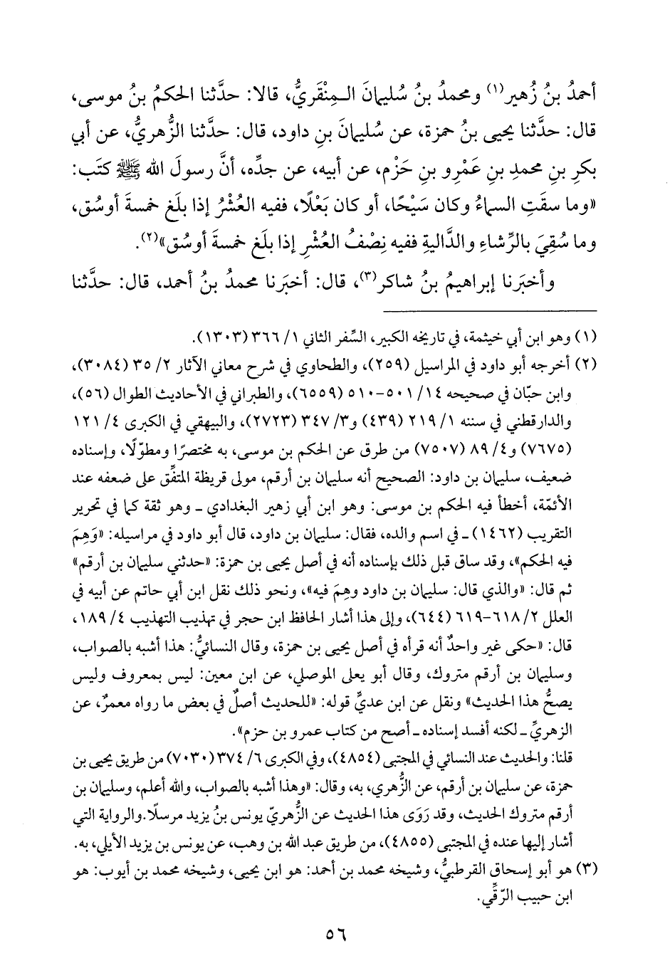 أحمدُ بنُ زُهير (¬١) ومحمدُ بنُ سُليمانَ المِنْقَريُّ، قالا: حدَّثنا الحكمُ بنُ موسى، قال: حدَّثنا يحيى بنُ حمزة، عن سُليمانَ بنِ داود، قال: حدَّثنا الزُّهريُّ، عن أبي بكرِ بنِ محمدِ بنِ عَمْرِو بنِ حَزْم، عن أبيه، عن جدِّه، أنَّ رسولَ الله -صلى الله عليه وسلم- كتَب: "وما سقَتِ السماءُ وكان سَيْحًا، أو كان بَعْلًا، ففيه العُشْرُ إذا بلَغ خمسةَ أوسُق، وما سُقِيَ بالرِّشاءِ والدَّاليةِ ففيه نِصفُ العُشْرِ إذا بلَغ خمسةَ أوسُق" (¬٢).