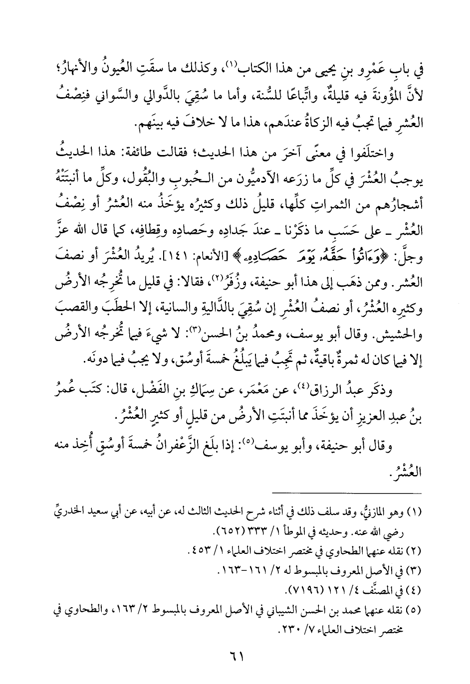واختلَفوا في معنًى آخرَ من هذا الحديث؛ فقالت طائفة: هذا الحديثُ يوجبُ العُشْرَ في كلِّ ما زرَعه الآدميُّون من الحُبوبِ والبُقُول، وكلِّ ما أنبتَتْهُ أشجارُهم من الثمراتِ كلِّها، قليلُ ذلك وكثيرُه يؤخَذُ منه العُشرُ أو نِصْفُ العُشْر -على حَسَبِ ما ذكَرْنا- عندَ جَدادِه وحَصادِه وقِطافِه، كما قال الله عزَّ وجلَّ: {وَآتُوا حَقَّهُ يَوْمَ حَصَادِهِ} [الأنعام: ١٤١]. يُريدُ العُشْرَ أو نصفَ العُشر. وممن ذهَب إلى هذا أبو حنيفة، وزُفَرُ (¬٢)، فقالا: في قليل ما تُخرِجُه الأرضُ وكثيرِه العُشْرُ، أو نصفُ العُشْرِ إن سُقِيَ بالدَّاليةِ والسانية، إلا الحطَبَ والقصبَ والحشيش. وقال أبو يوسف، ومحمدُ بنُ الحسن (¬٣): لا شيءَ فيما تُخرجُه الأرضُ إلا فيما كان له ثمرةٌ باقيةٌ، ثم تَجِبُ فيما يَبلُغُ خمسةَ أوسُق، ولا يجبُ فيما دونَه.