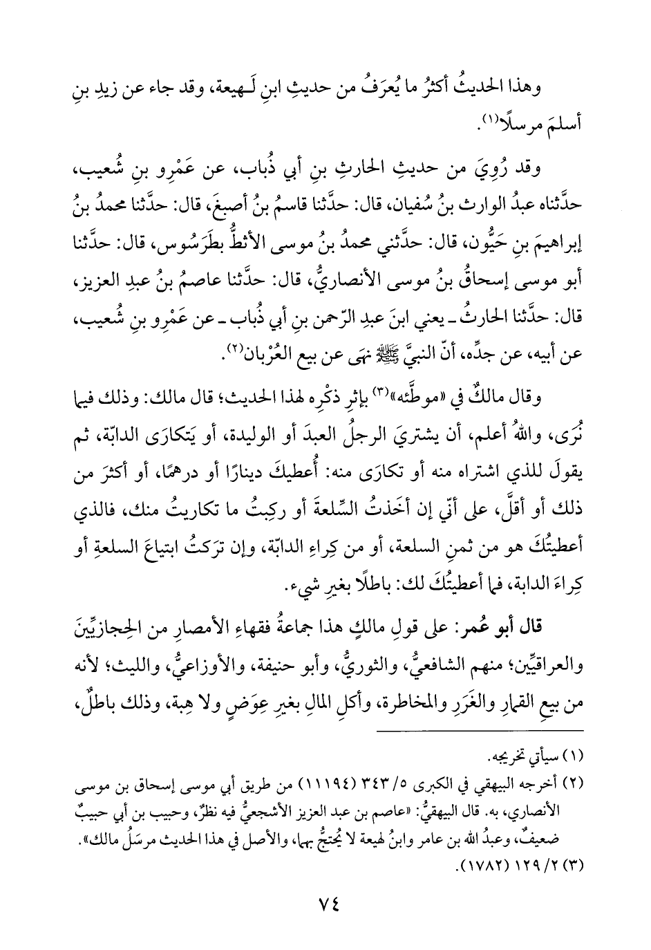 وقد رُوِيَ من حديثِ الحارثِ بنِ أبي ذُباب، عن عَمْرِو بنِ شُعيب، حدَّثناه عبدُ الوارث بنُ سُفيان، قال: حدَّثنا قاسمُ بنُ أصبغَ، قال: حدَّثنا محمدُ بنُ إبراهيمَ بنِ حَيُّون، قال: حدَّثني محمدُ بنُ موسى الأثطُّ بطَرَسُوس، قال: حدَّثنا أبو موسى إسحاقُ بنُ موسى الأنصاريُّ، قال: حدَّثنا عاصمُ بنُ عبدِ العزيز، قال: حدَّثنا الحارثُ -يعني ابنَ عبدِ الرّحمن بنِ أبي ذُباب- عن عَمْرِو بنِ شعيب، عن أبيه، عن جدِّه، أنّ النبيَّ -صلي الله عليه وسلم- نهَى عن بيع العُرْبان (¬٢).