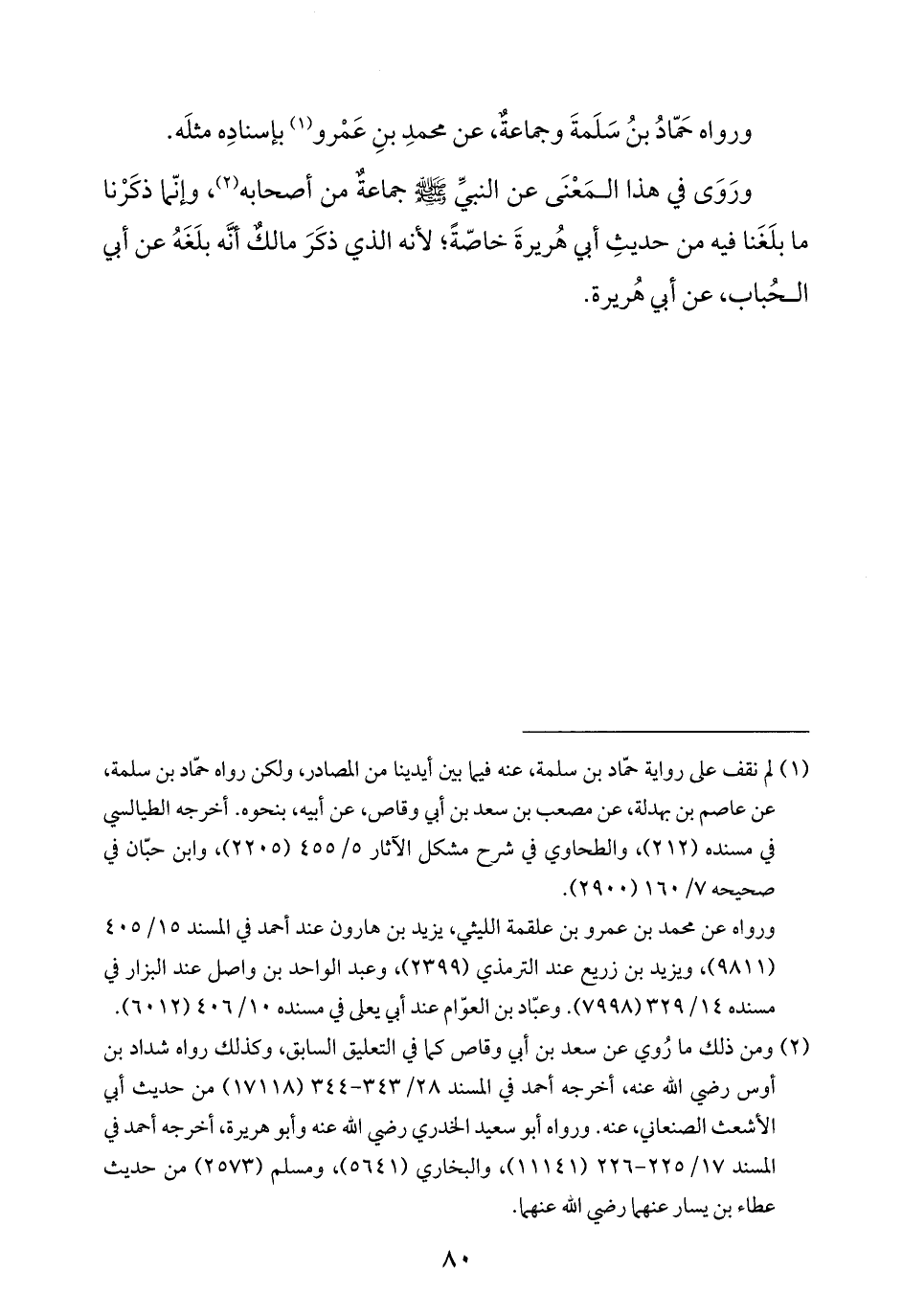 ورَوَى في هذا المَعْنَى عن النبيِّ -صلي الله عليه وسلَّم- جماعةٌ من أصحابه (¬٢)، وإنّما ذكَرْنا ما بلَغَنا فيه من حديثِ أبي هُريرةَ خاصّةً؛ لأنه الذي ذكَرَ مالكٌ أنَّه بلَغَهُ عن أبي الحُباب، عن أبي هُريرة.