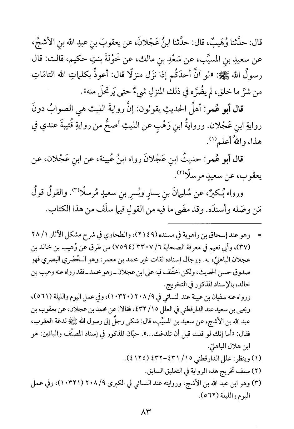 ورواه عنه سفيان بن عيينة عند النسائي في ٩/ ٢٠٨ (١٠٣٢٠)، وفي عمل اليوم والليلة (٥٦١)، ويحيى بن سعيد عند الدارقطني في العلل ١٥/ ٤٣٢، فقالا: عن محمد بن عجلان، عن يعقوب بن عبد الله بن الأشج، عن سعيد بن المسيِّب، قال: شكى رجلٌ إلى رسول الله -صلي الله عليه وسلَّم- لدغة العقرب، فقال: "أما إنك لو قلت قبل أن تلدغك ... ". حبّان المذكور في إسناد المصنِّف والباقين: هو ابن هلال الباهليّ.