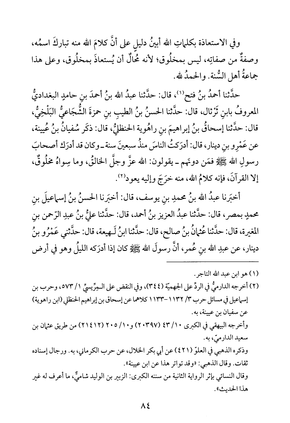 حدَّثنا أحمدُ بنُ فتح (¬١)، قال: حدَّثنا عبدُ الله بنُ أحمدَ بنِ حامدٍ البغداديُّ المعروفُ بابنِ ثَرْثال، قال: حدَّثنا الحسنُ بنُ الطيبِ بنِ حمزةَ الشُّجَاعيُّ البَلْخِيُّ، قال: حدَّثنا إسحاقُ بنُ إبراهيمَ بنِ راهُوية الحنظليُّ، قال: ذكَر سُفيانُ بنُ عُيينة، عن عَمْرِو بنِ دينار، قال: أدرَكتُ الناسَ منذُ سبعينَ سنة -وكان قد أدرَك أصحابَ رسولِ الله -صلى الله عليه وسلم- فمَن دونَهم- يقولون: الله عزَّ وجلَّ الخالقُ، وما سِواهُ مخلُوقٌ، إلا القرآنَ، فإنه كلامُ الله، منه خرَجَ وإليه يعود (¬٢).