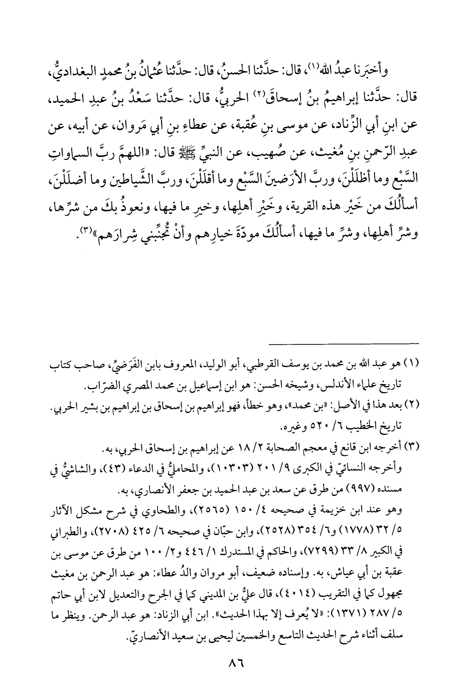 وأخبَرنا عبدُ الله (¬١)، قال: حدَّثنا الحسنُ، قال: حدَّثنا عُثمانُ بنُ محمدٍ البغداديُّ، قال: حدَّثنا إبراهيمُ بنُ إسحاقَ (¬٢) الحربيُّ، قال: حدَّثنا سَعْدُ بنُ عبدِ الحميد، عن ابنِ أبي الزِّناد، عن موسى بنِ عُقبة، عن عطاءِ بنِ أبي مَروان، عن أبيه، عن عبدِ الرّحمنِ بنِ مُغيث، عن صُهيب، عن النبيِّ -صلي الله عليه وسلَّم- قال: "اللهمَّ ربَّ السماواتِ السَّبعْ وما أظلَلْنَ، وربَّ الأرَضينَ السَّبعْ وما أقلَلْنَ، وربَّ الشَّياطين وما أضلَلْنَ، أسألُكَ من خَيْر هذه القرية، وخَيْرِ أهلِها، وخيرِ ما فيها، ونعوذُ بكَ من شرِّها، وشرِّ أهلِها، وشرِّ ما فيها، أسألُكَ مودّةَ خيارِهم وأنْ تُجنِّبني شِرارَهم" (¬٣).