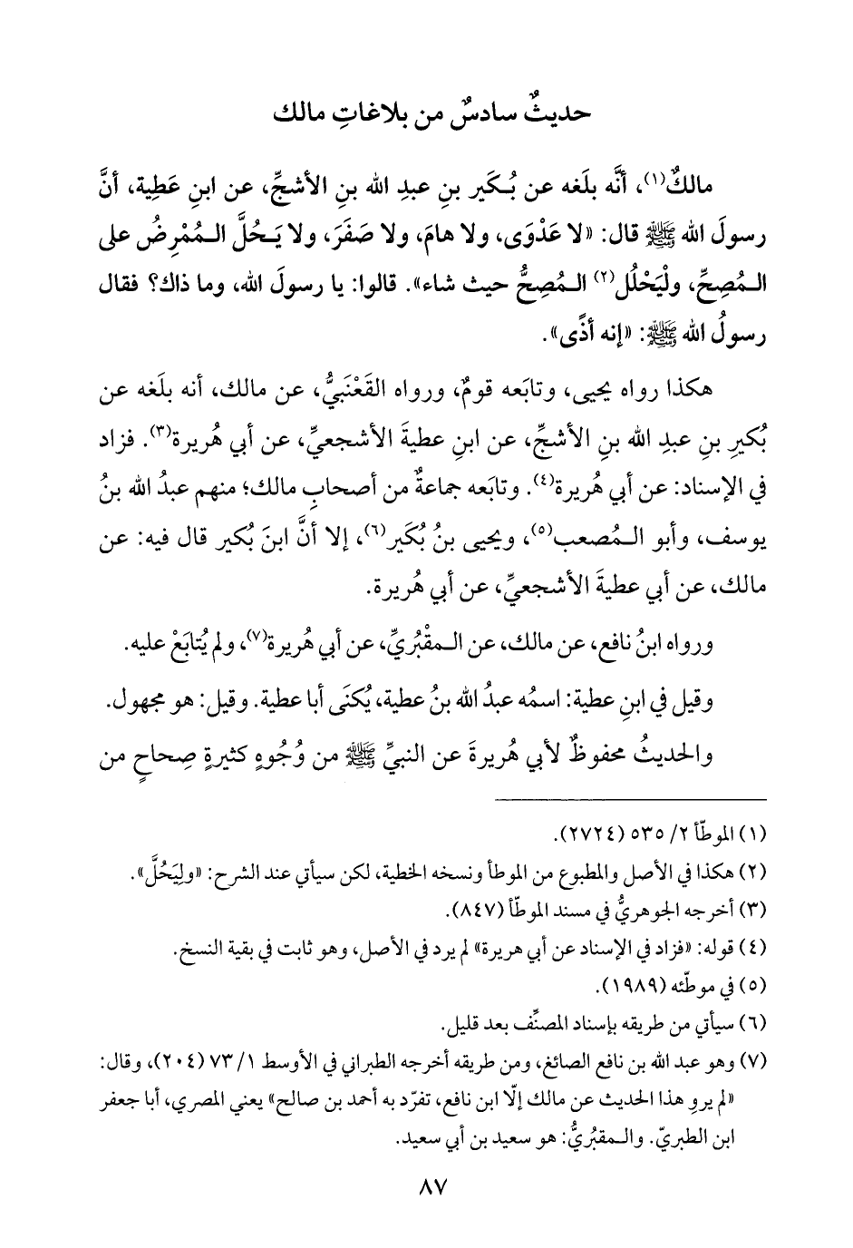 مالكٌ (¬١)، أنَّه بلَغه عن بُكَير بنِ عبدِ الله بنِ الأشجِّ، عن ابنِ عَطِية، أنَّ رسولَ الله -صلي الله عليه وسلَّم- قال: "لا عَدْوَى، ولا هامَ، ولا صَفَرَ، ولا يَحُلَّ المُمْرِضُ على المُصِحِّ، ولْيَحْلُل (¬٢) المُصِحُّ حيث شاء". قالوا: يا رسولَ الله -صلي الله عليه وسلَّم-، وما ذاك؟ فقال رسولُ الله -صلي الله عليه وسلَّم-: "إنه أذًى".