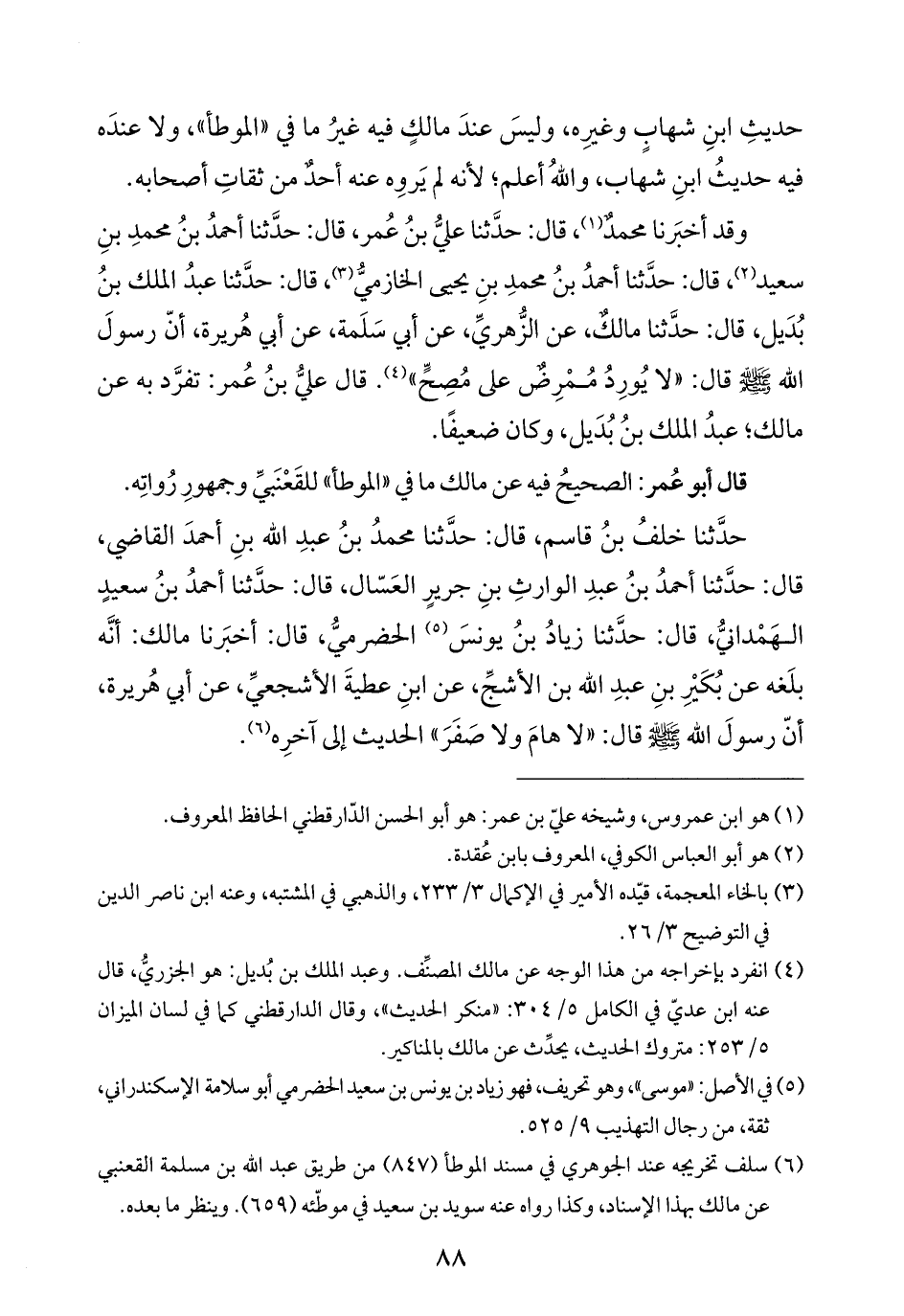 حدَّثنا خلفُ بنُ قاسم، قال: حدَّثنا محمدُ بنُ عبدِ الله بنِ أحمدَ القاضي، قال: حدَّثنا أحمدُ بنُ عبدِ الوارثِ بنِ جريرٍ العَسّال، قال: حدَّثنا أحمدُ بنُ سعيدٍ الهَمْدانيُّ، قال: حدَّثنا زيادُ بنُ يونسَ (¬٥) الحضرميُّ، قال: أخبَرنا مالك: أنَّه بلَغه عن بُكَيْرِ بنِ عبدِ الله بن الأشجِّ، عن ابنِ عطيةَ الأشجعيِّ، عن أبي هُريرة، أنّ رسولَ الله -صلي الله عليه وسلَّم- قال: "لا هامَ ولا صَفَرَ" الحديث إلى آخرِه (¬٦).