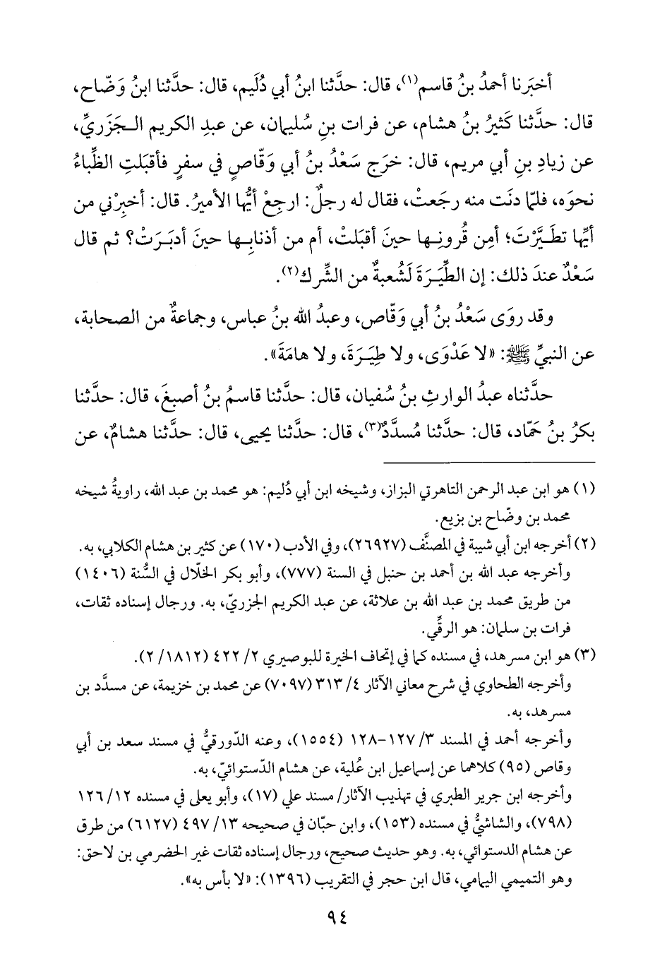 أخبَرنا أحمدُ بنُ قاسم (¬١)، قال: حدَّثنا ابنُ أبي دُلَيم، قال: حدَّثنا ابنُ وَضّاح، قال: حدَّثنا كَثيرُ بنُ هشام، عن فرات بنِ سُليمان، عن عبدِ الكريم الجَزَريِّ، عن زيادِ بنِ أبي مريم، قال: خرَج سَعْدُ بنُ أبي وَقّاصٍ في سفرٍ فأقبَلتِ الظِّباءُ نحوَه، فلمّا دنَت منه رجَعتْ، فقال له رجلٌ: ارجِعْ أيُّها الأميرُ. قال: أخبِرْني من أيِّها تطَيَّرْتَ؛ أمِن قُرونِها حينَ أقبَلتْ، أم من أذنابِها حينَ أدبَرَتْ؟ ثم قال سَعْدٌ عندَ ذلك: إن الطِّيَرَةَ لَشُعبةٌ من الشِّرك (¬٢).