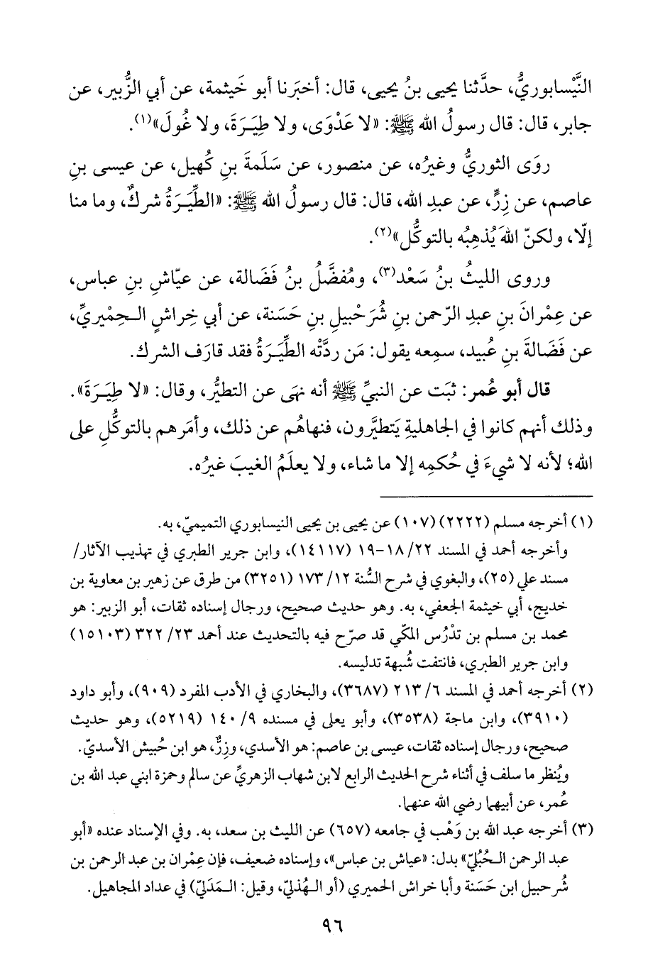 روَى الثوريُّ وغيرُه، عن منصور، عن سَلَمةَ بنِ كُهيل، عن عيسى بنِ عاصم، عن زِرٍّ، عن عبدِ الله، قال: قال رسولُ الله -صلي الله عليه وسلَّم-: "الطِّيَرَةُ شركٌ، وما منا إلّا، ولكنّ الله يُذهِبُه بالتوكُّل" (¬٢).