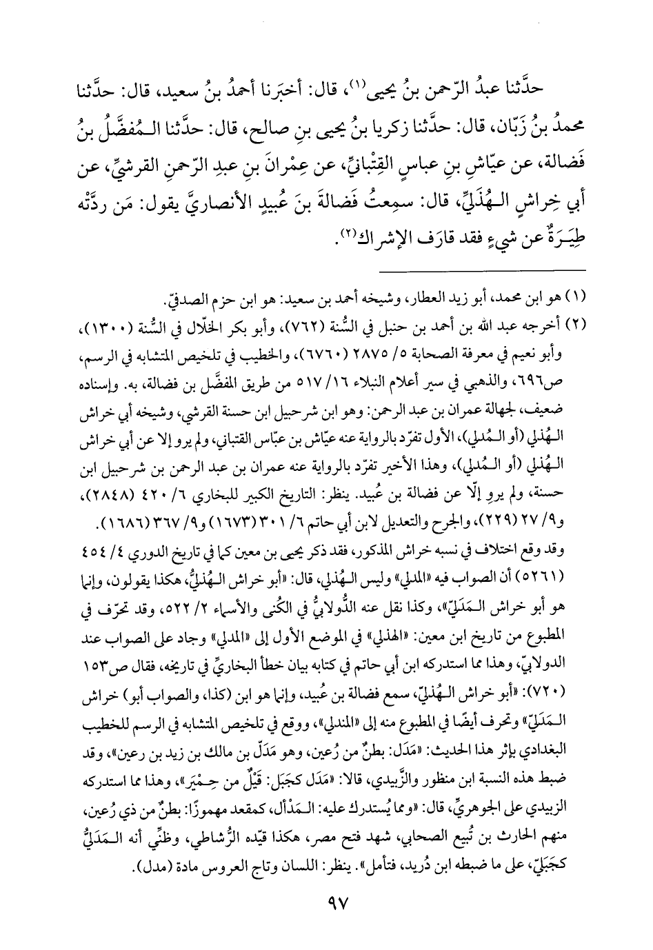 (¬٢) أخرجه عبد الله بن أحمد بن حنبل في السُّنة (٧٦٢)، وأبو بكر الخلّال في السُّنة (١٣٠٠)، وأبو نعيم في معرفة الصحابة ٥/ ٢٨٧٥ (٦٧٦٠)، والخطيب في تلخيص المتشابه في الرسم، ص ٦٩٦، والذهبي في سير أعلام النبلاء ١٦/ ٥١٧ من طريق المفضَّل بن فضالة، به. وإسناده ضعيف، لجهالة عمران بن عبد الرحمن: وهو ابن شرحبيل ابن حسنة القرشي، وشيخه أبي خراش الهُذلي (أو المُدلي)، الأول تفرّد بالرواية عنه عيّاش بن عبّاس القتباني، ولم يرو إلا عن أبي خراش الهُذلى (أو المُدلي)، وهذا الأخير تفرّد بالرواية عنه عمران بن عبد الرحمن بن شرحبيل ابن حسنة، ولم يروِ إلّا عن فضالة بن عُبيد. ينظر: التاريخ الكبير للبخاري ٦/ ٤٢٠ (٢٨٤٨)، و ٩/ ٢٧ (٢٢٩)، والجرح والتعديل لابن أبي حاتم ٦/ ٣٠١ (١٦٧٣) و ٩/ ٣٦٧ (١٦٨٦).