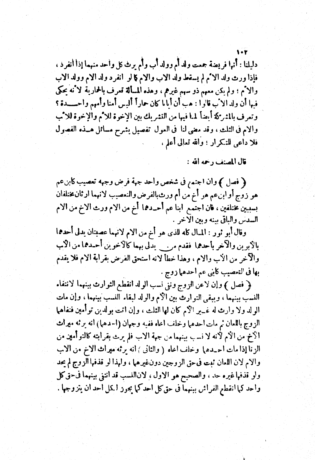 وان اجتمع في شخص واحد جهة فرض وجهه تعصيب كابن عم هو زوج أو ابن عم هو أخ من أم ورث بالفرض والتعصيب لانهما ارثان مختلفان بسببين مختلفين، فان اجتمع ابنا عم أحدهما أخ من الام ورث الاخ من الام السدس والباقى بينه وبين الاخر.