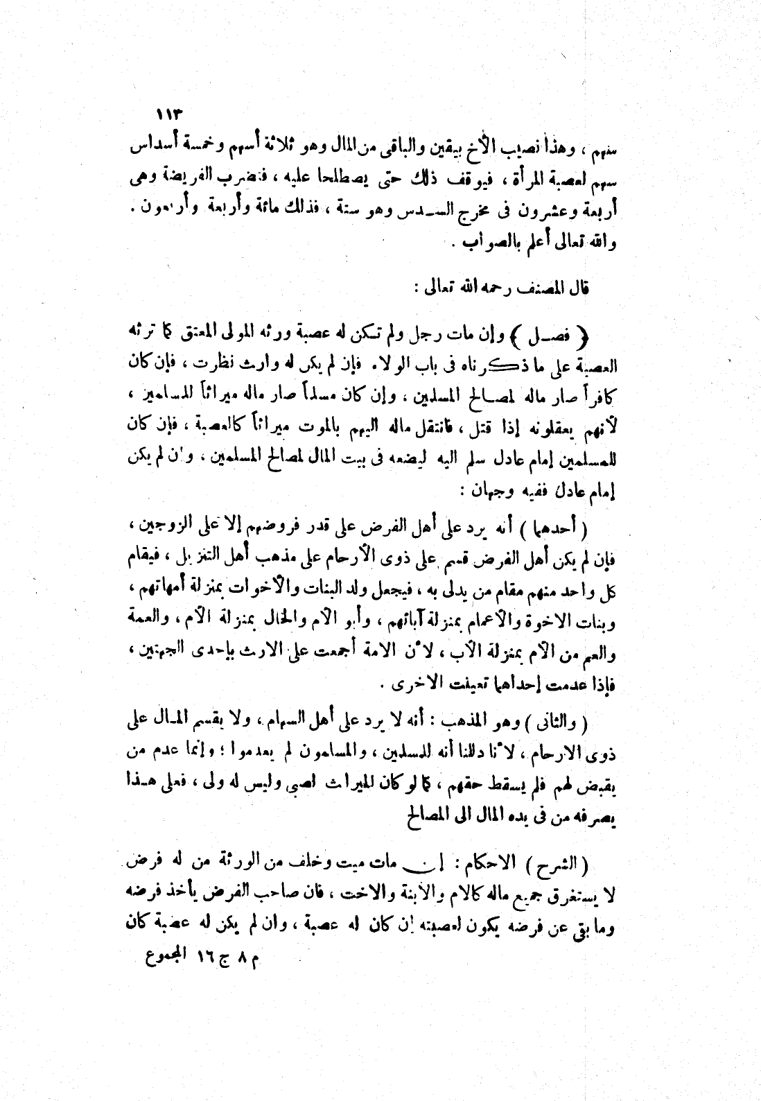 يقبض لهم فلم يسقط حقهم، كما لو كان الميراث لصبى وليس له ولى، فعلى هذا يصرفه من في يده المال إلى المصالح (الشرح) الاحكام: إن مات ميت وخلف من الورثة من له فرض لا يستغرق جميع ماله كالام والابنة والاخت، فان صاحب الفرض يأخذ فرضه وما بقى عن فرضه يكون لعصبته إن كان له عصبة، وان لم يكن له عصبة كان
