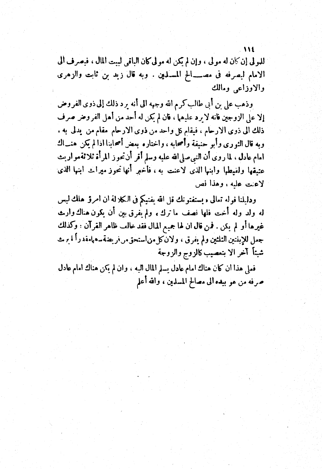وكذلك جعل للابنتين الثلثين ولم يفرق، ولان كل من استحق من فريضة سهما مقدرا لم يرث شيئا آخر الا بتعصيب كالزوج والزوجة فعلى هذا ان كان هناك امام عادل يسلم المال إليه، وان لم يكن هناك امام عادل