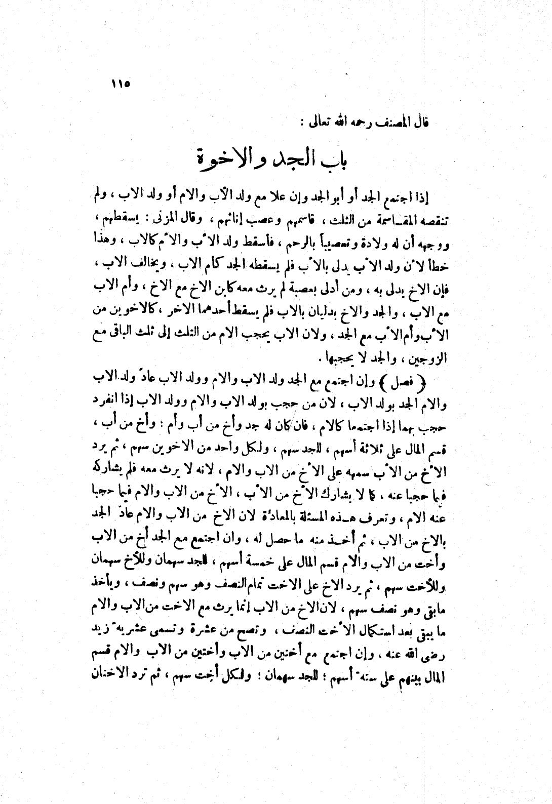 ما بقى وهو نصف سهم، لان الاخ من الاب إنما يرث مع الاخت من الاب والام ما يبقى بعد استكمال الاخت النصف، وتصح من عشرة وتسمى عشرية زيد رضى الله عنه، وإن اجتمع مع أختين من الاب وأختين من الاب والام قسم المال بينهم على ستة أسهم للجد سهمان، ولكل أخت سهم، ثم ترد الاختان