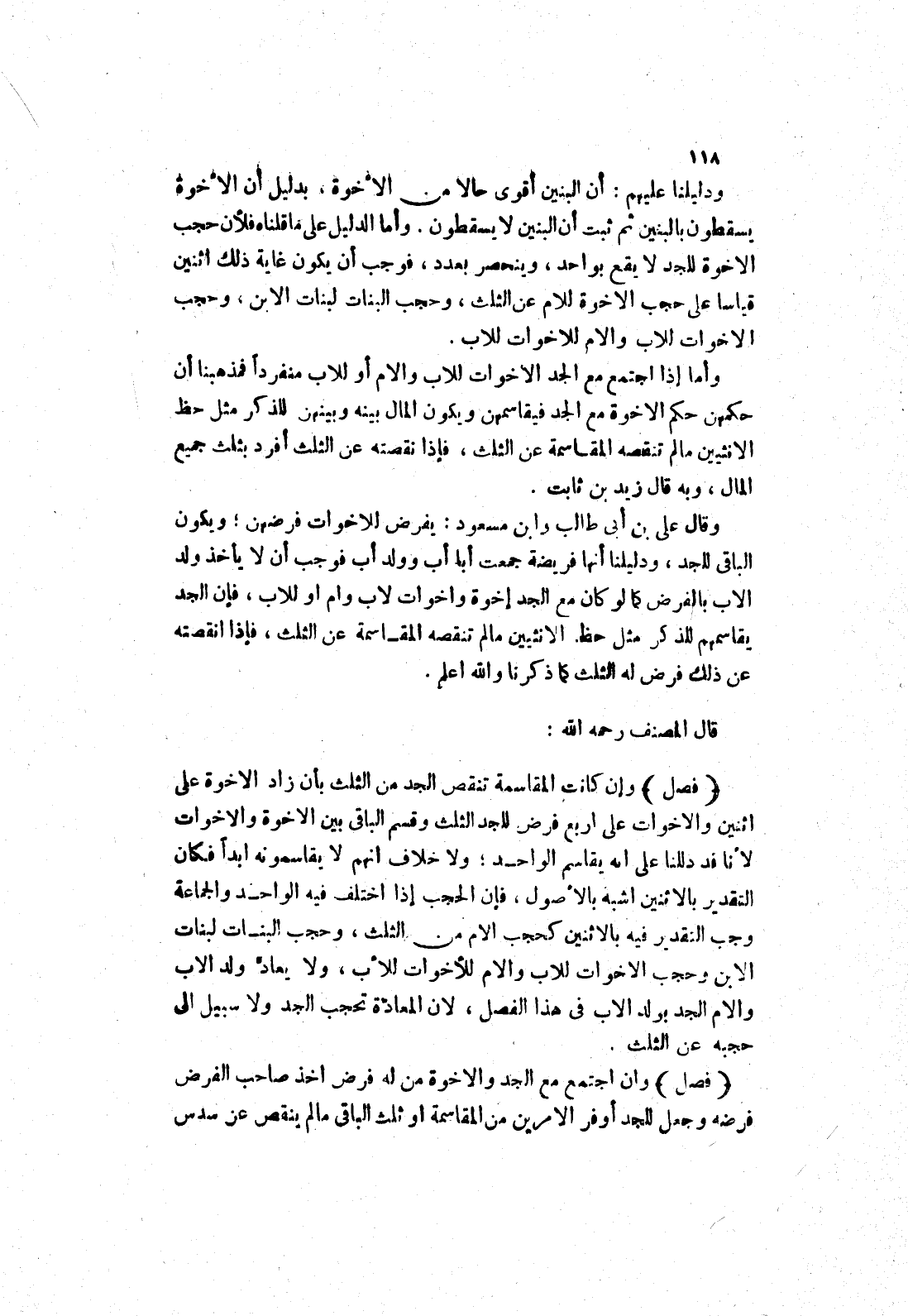 وإن كانت المقاسمة تنقص الجد من الثلث بأن زاد الاخوة على اثنين والاخوات على اربع فرض للجد الثلث وقسم الباقي بين الاخوة والاخوات لانا قد دللنا على انه يقاسم الواحد، ولا خلاف انهم لا يقاسمونه ابدا فكان التقدير بالاثنين اشبه بالاصول، فإن الحجب إذا اختلف فيه الواحد والجماعة وجب التقدير فيه بالاثنين كحجب الام من الثلث، وحجب البنات لبنات الابن وحجب الاخوات للاب والام للاخوات للاب، ولا يعاد ولد الاب والام الجد بولد الاب في هذا الفصل، لان المعاذة تحجب الجد ولا سبيل إلى حجبه عن الثلث.