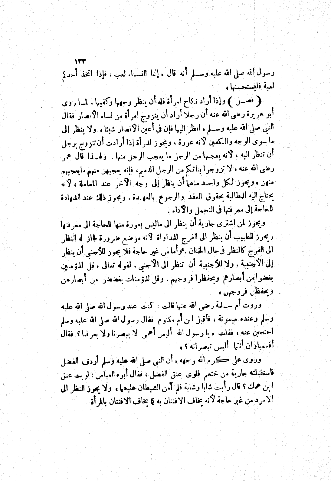وروت أم سملة رضى الله عنها قالت: كنت عِنْدَ رَسُولِ اللَّهِ صَلَّى اللَّهُ عَلَيْهِ وَسَلَّمَ وعنده ميمونة، فأقبل ابن أُمِّ مَكْتُومٍ فَقَالَ رَسُولُ اللَّهِ صَلَّى اللَّهُ عَلَيْهِ وَسَلَّمَ احتجبن عنه، فقلت (يا رسول الله أليس أعمى لا يبصرنا ولا يعرفنا؟ فقال أفعمياوان أنتما أليس تبصرانه؟) وروى عَلِيٍّ كَرَّمَ اللَّهُ وَجْهَهُ (أَنَّ النَّبِيَّ صَلَّى اللَّهُ عَلَيْهِ وَسَلَّمَ أَرْدَفَ الفضل فاستقبلته جارية من خثعم فلوى عنق الفضل، فقال أبوه العباس: لَوَيْتَ عُنُقَ ابْنِ عَمِّكَ؟ قَالَ رَأَيْتُ شَابًّا وشابة فلم آمن الشيطان عليهما) ولا يجوز النظر إلى الامرد من غير حاجة لانه يخاف الافتتان به كما يخاف الافتتان بالمرأة