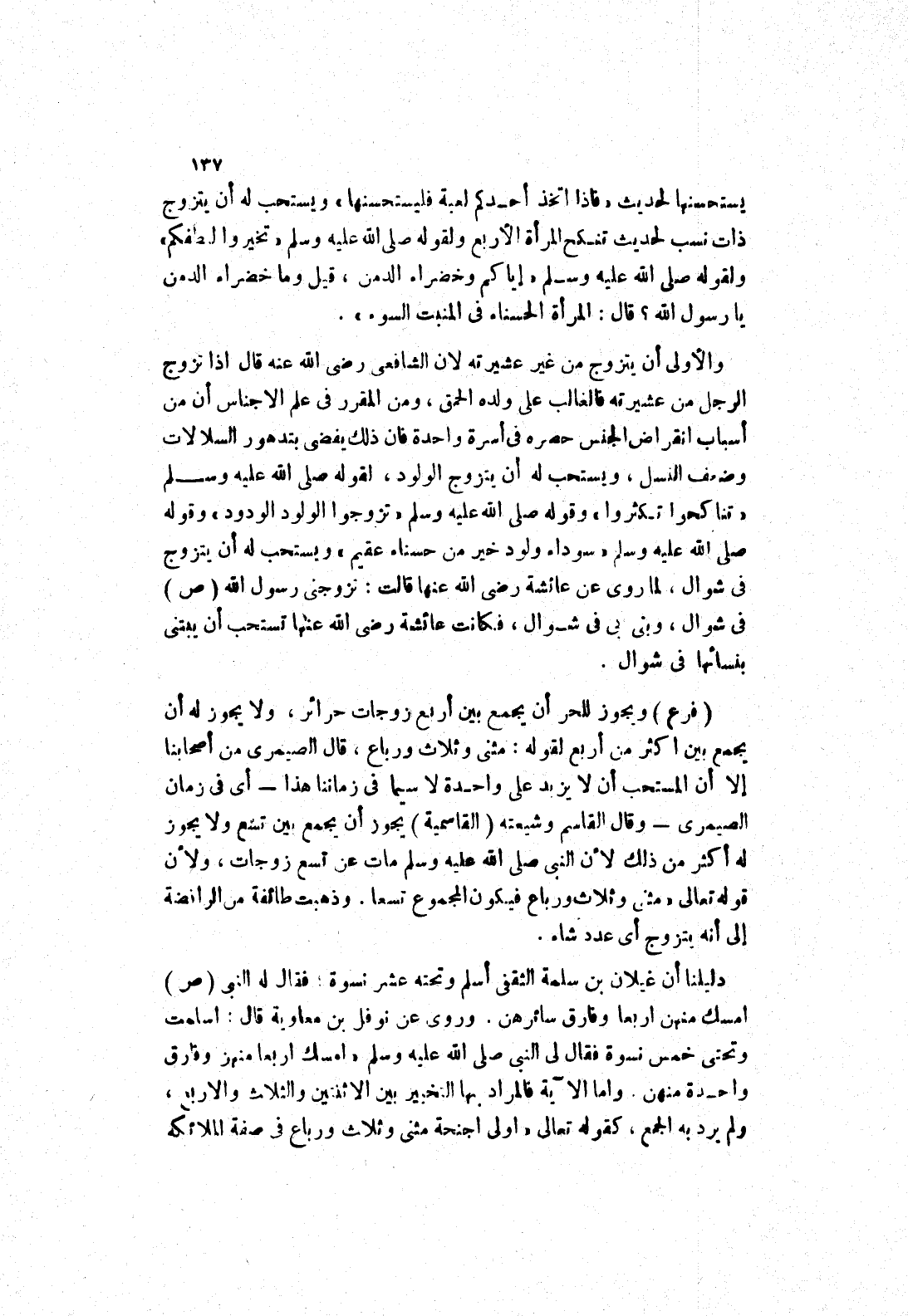 ويجوز للحر أن يجمع بين أربع زوجات حرائر، ولا يجوز له أن يجمع بين أكثر من أربع لقوله: مثنى وثلاث ورباع، قال الصيمري من أصحابنا إلا أن المستحب أن لا يزيد على واحدة لاسيما في زماننا هذا أي في زمان الصيمري وقال القاسم وشيعته (القاسمية) يجوز أن يجمع بين تسع ولا يجوز له أكثر من ذَلِكَ لِأَنَّ النَّبِيَّ صَلَّى اللَّهُ عَلَيْهِ وَسَلَّمَ مات عن تسع زوجات، ولان قوله تعالى (مثنى وثلاث ورباع فيكون المجموع تسعا.