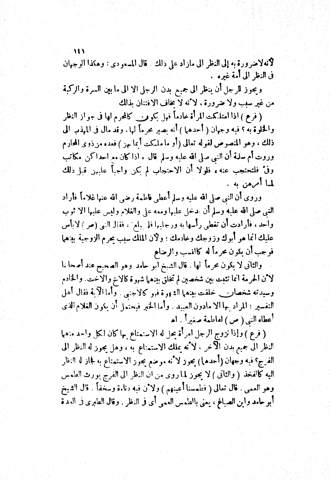 وَرُوِيَ أَنَّ النَّبِيَّ صَلَّى اللَّهُ عَلَيْهِ وَسَلَّمَ أعطى فاطمة رضى الله عنها غلاما فأراد النبي صلى الله عليه وسلم أن يدخل عليها ومعه على والغلام وليس عليها الا ثوب واحد، فأرادت أن تغطى رأسها به ورجليها فلم يبلغ، فَقَالَ النَّبِيُّ صَلَّى اللَّهُ عَلَيْهِ وَسَلَّمَ لَا بأس عليك انما هو أبوك وزوجك وخادمك، ولان الملك سبب يحرم الزوجية بينهما فوجب أن يكون محرما له كالنسب والرضاع.