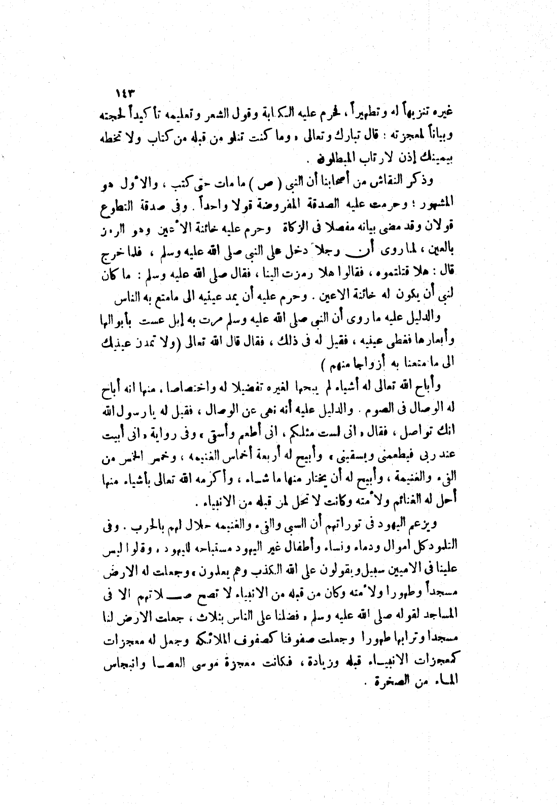 وَالدَّلِيلُ عَلَيْهِ مَا رُوِيَ أَنَّ النَّبِيَّ صَلَّى اللَّهُ عَلَيْهِ وَسَلَّمَ مرت به إبل عست بأبوالها وأبعارها فغطى عينيه، فقيل له في ذلك، فقال قال الله تعالى (ولا تمدن عينيك إلى ما متعنا به أزواجا منهم) وأباح الله تعالى له أشياء لم يبحها لغيره تفضيلا له واختصاصا، منها انه أباح له الوصال في الصوم.