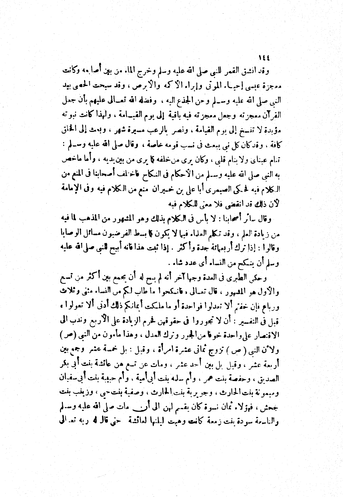 وقد انشق القمر للنبى صلى الله عليه وسلم وخرج الماء من بين أصابعه وكانت معجزة عيسى إحياء الموتى وإبراء الاكمه والابرص، وقد سبحت الحصى بيد النبي صلى الله عليه وسلم وحن الجذع إليه، وفضله الله تعالى عليهم بأن جعل القرآن معجزته وجعل معجزته فيه باقية إلى يوم القيامة، ولهذا كانت نبوته مؤبدة لا تنسخ إلى يوم القيامة، ونصر بالرعب مسيرة شهر، وبعث إلى الخلق كافة، وقد كان كل نبى يبعث في نسب قومه خاصة، وقال صلى الله عليه وسلم: تنام عيناى ولا ينام قلبى، وكان يرى من خلفه كما يرى من بين يديه، وأما ما خص بِهِ النَّبِيُّ صَلَّى اللَّهُ عَلَيْهِ وَسَلَّمَ مِنْ الاحكام في النكاح فاختلف أصحابنا في المنع من الكلام فيه فحكى الصيمري أبا على بن خيران منع من الكلام فيه وفى الامامة لان ذلك قد انقضى فلا معنى للكلام فيه.