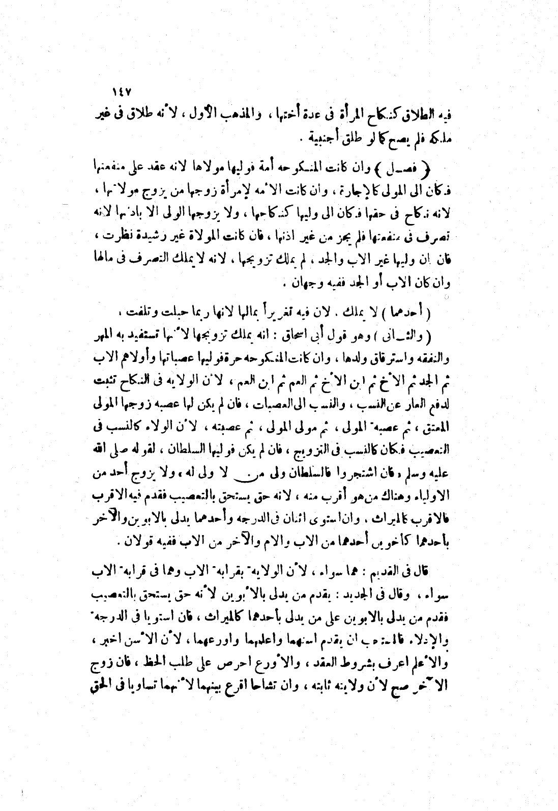 وهو قول أبى اسحاق: انه يملك تزويجها لانها تستفيد به المهر والنفقه واسترقاق ولدها، وان كانت المنكوحة حرة فوليها عصباتها وأولاهم الاب ثم الجد ثُمَّ الْأَخُ ثُمَّ ابْنُ الْأَخِ ثُمَّ الْعَمُّ ثم ابن العم، لان الولاية في النكاح تثبت لدفع العار عن النسب، والنسب إلى العصبات، فان لم يكن لها عصبه زوجها المولى المعتق، ثم عصبة المولى، ثم مولى المولى، ثم عصبته، لان الولاء كالنسب في التعصيب فكان كالنسب في التزويج، فان لم يكن فوليها السلطان، لقوله صلى الله عليه وسلم (فان اشتجروا فالسلطان ولى من لا ولى له) ولا يزوج أحد من الاولياء وهناك من هو أقرب منه، لانه حق يستحق بالتعصيب فقدم فيه الاقرب فالاقرب كالميراث، وان استوى اثنان في الدرجه وأحدهما يدلى بالابوين والآخر بأحدهما كأخوين أحدهما من الاب والام والآخر من الاب ففيه قولان.